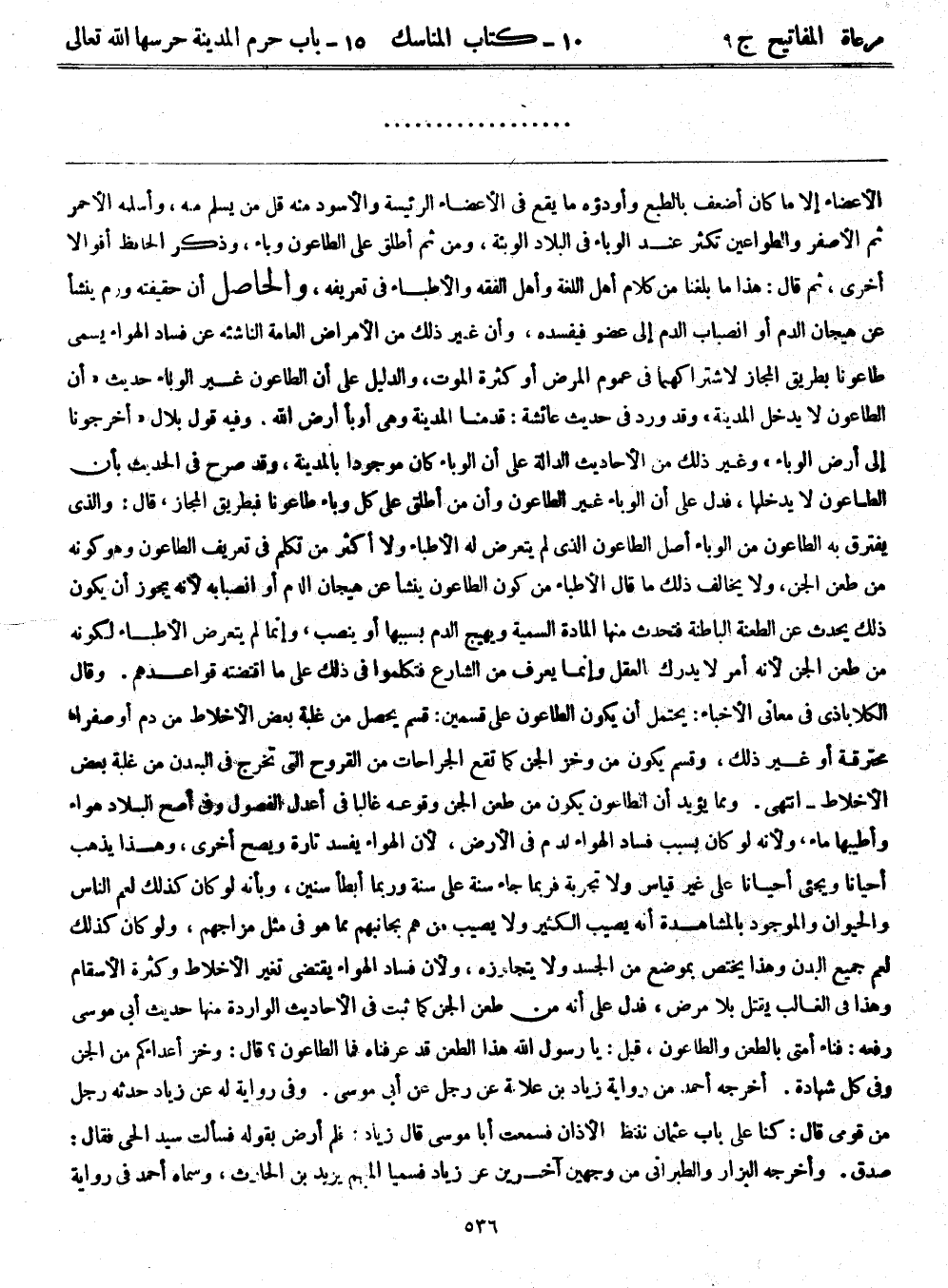 الأعضاء إلا ما كان أضعف بالطبع وأودؤه ما يقع في الأعضاء الرئيسية، والأسود منه قل من يسلم منه، وأسلمه الأحمر ثم الأصفر والطواعين تكثر عند الوباء في البلاد الوبئة، ومن ثم أطلق على الطاعون وباء، وذكر الحافظ أقوالاً أخرى، ثم قال: هذا ما بلغنا من كلام أهل اللغة وأهل الفقه والأطباء في تعريفه، والحاصل أن حقيقته ورم ينشأ عن هيجان الدم أو انصباب الدم إلى عضو فيفسده، وأن غير ذلك من الأمراض العامة الناشئة عن فساد الهواء يسمى طاعونًا بطريق المجاز لاشتراكهما في عموم المرض أو كثرة الموت، والدليل على أن الطاعون غير الوباء حديث ((أن الطاعون لا يدخل المدينة)) . وقد ورد في حديث عائشة: قدمنا المدينة وهي أوبأ أرض الله. وفيه قول بلال ((أخرجونا إلى أرض الوباء)) ، وغير ذلك من الأحاديث الدالة على أن الوباء كان موجودًا بالمدينة، وقد صرح في الحديث بأن الطاعون لا يدخلها، فدل على أن الوباء غير الطاعون وأن من أطلق على كل وباء طاعونًا فبطريق المجاز، قال: والذي يفترق به الطاعون من الوباء أصل الطاعون الذي لم يتعرض له الأطباء ولا أكثر من تكلم في تعريف الطاعون وهو كونه من طعن الجن، ولا يخالف ذلك ما قال الأطباء من كون الطاعون ينشأ عن هيجان الدم أو انصبابه لأنه يجوز أن يكون ذلك يحدث عن الطعنة الباطنة فتحدث منها المادة السمية ويهيج الدم بسببها أو ينصب، وإنما لم يتعرض الأطباء لكونه من طعن الجن لأنه أمر لا يدرك العقل، وإنما يعرف من الشارع فتكلموا في ذلك على أن ما اقتضته قواعدهم. وقال الكلاباذي في معاني الأخباء: يحتمل أن يكون الطاعون على قسمين: قسم يحصل من غلبة بعض الأخلاط من دم أو صفراء محترقة أو غير ذلك، وقسم يكون من وخز الجن كما تقع الجراحات من القروح التي تخرج في البدن من غلبة بعض الأخلاط – انتهى. ومما يؤيد أن الطاعون يكون من طعن الجن وقوعه غالبًا في أعدل الفصول، وفي أصح البلاد هواء وأطيبها ماء، ولأنه لو كان بسبب فساد الهواء لدم في الأرض، لأن الهواء يفسد تارة ويصح أخرى، وهذا يذهب أحيانًا ويجيء أحيانًا على غير قياس ولا تجربة فربما جاء سنة على سنة، وربما أبطأ سنين، وبأنه لو كان كذلك لعم الناس والحيوان والموجود بالمشاهدة أنه يصيب الكثير ولا يصيب من هم بجانبهم مما هو في مثل مزاجهم، ولو كان كذلك لعم جميع البدن، وهذا يختص بموضع من الجسد ولا يتجاوزه، ولأن فساد الهواء يقتضي تغير الأخلاط وكثرة الأسقام، وهذا في الغالب يقتل بلا مرض، فدل على أنه من طعن الجن كما ثبت في الأحاديث الواردة منها حديث أبي موسى رفعه: " فناء أمتي بالطعن والطاعون "، قيل: يا رسول الله هذا الطعن قد عرفناه فما الطاعون؟ قال: " وخز أعداءكم من الجن وفي كل شهادة ". أخرجه أحمد من رواية زياد بن علا ة عن رجل عن أبي موسى. وفي رواية له عن زياد حدثه رجل من قومي قال: كنا على باب عثمان ننتظر الأذان فسمعت أبا موسى قال زياد: فلم أرض بقوله فسألت سيد الحي فقال: صدق. وأخرجه البزار والطبراني من وجهين آخرين عن زياد فسميا المبهم يزيد بن الحارث، وسماه أحمد في رواية