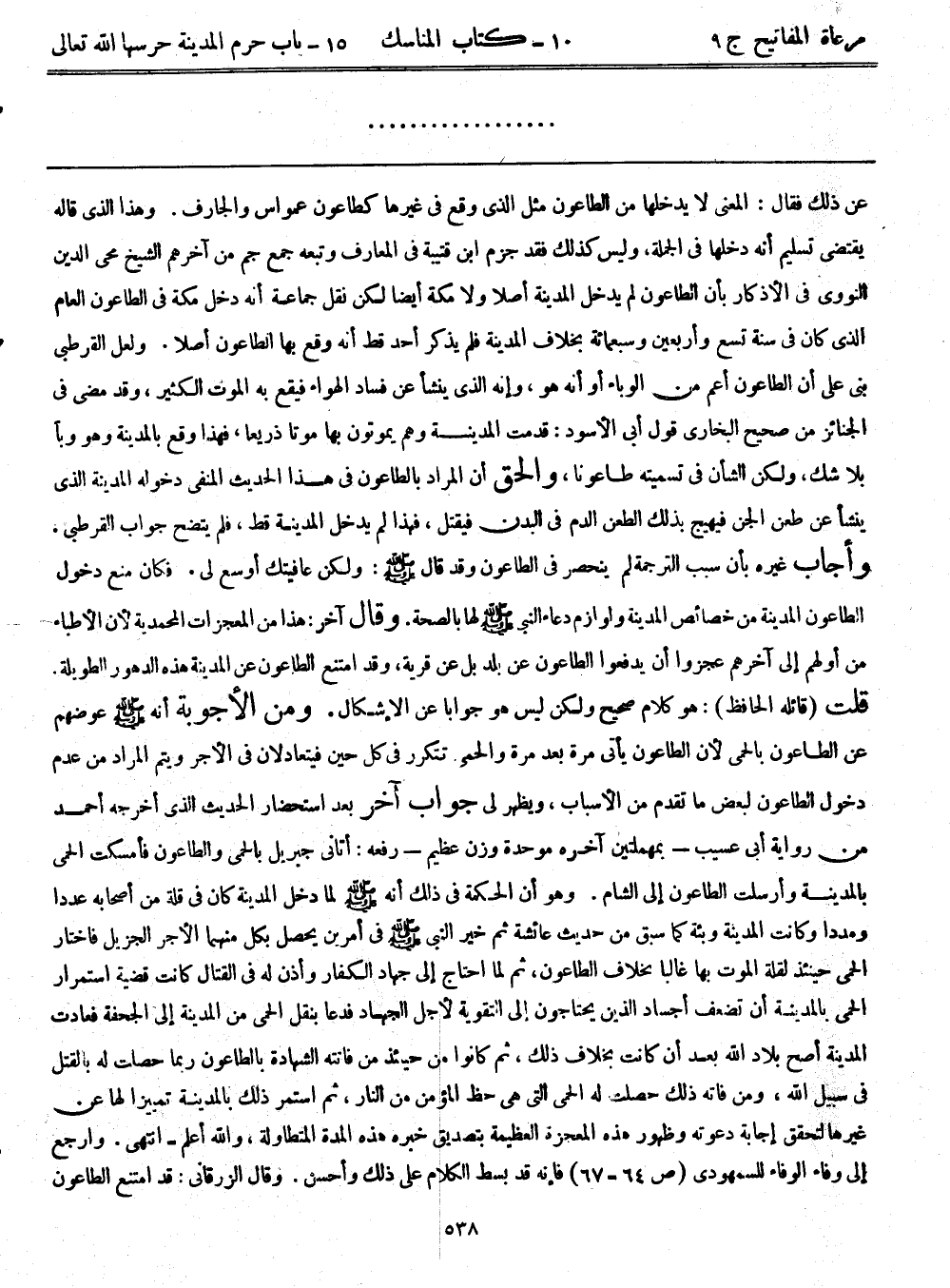 عن ذلك فقال: المعنى لا يدخلها من الطاعون مثل الذي وقع في غيرها كطاعون عمواس والجارف. وهذا الذي قاله يقتضى تسليم أنه دخلها في الجملة، وليس كذلك فقد جزم ابن قتيبة في المعارف وتبعه جمع جم من آخرهم الشيخ محيي الدين النووي في الأذكار بأن الطاعون لم يدخل المدينة أصلاً ولا مكة أيضًا لكن نقل جماعة أنه دخل مكة في الطاعون العام الذي كان في سنة تسع وأربعين وسبعمائة بخلاف المدينة فلم يذكر أحد قط أنه وقع بها الطاعون أصلاً. ولعل القرطبي بنى على أن الطاعون أعم من الوباء أو أنه هو، وإنه الذي ينشأ عن الفساد الهواء فيقع به الموت الكثير، وقد مضى في الجنائز من صحيح البخاري قول أبي الأسود: قدمت المدينة وهم يموتون بها موتاً ذريعاً، فهذا وقع بالمدينة وهو وباءً بلا شك، ولكن الشأن في تسميته طاعونًا، والحق أن المراد بالطاعون في هذا الحديث المنفي دخوله المدينة الذي ينشأ عن طعن الجن فيهيج بذلك الطعن الدم في البدن فيقتل، فهذا لم يدخل المدينة قط، فلم يتضح جواب القرطبي، وأجاب غيره بأن سبب الترجمة لم ينحصر في الطاعون وقد قال - صلى الله عليه وسلم -: ولكن عافيتك أوسع لي. فكان منع دخول الطاعون المدينة من خصائص المدينة ولوازم دعاء النبي - صلى الله عليه وسلم - لها بالصحة وقال آخر: هذا من المعجزات المحمدية لأن الأطباء من أولهم إلى آخرهم عجزوا أن يدفعوا الطاعون عن بلد بل عن قرية، وقد امتنع الطاعون عن المدينة هذه الدهور الطويلة. قلت (قائله الحافظ) : هو كلام صحيح ولكن ليس هو جواباً عن الإشكال. ومن الأجوبة أنه - صلى الله عليه وسلم - عوضهم عن الطاعون بالحمى لأن الطاعون يأتي مرة بعد مرة والحمى تتكرر في كل حين فيتعادلان في الأجر ويتم المراد من عدم دخول الطاعون لبعض ما تقدم من الأسباب، ويظهر لي جواب آخر بعد استحضار الحديث الذي أخرجه أحمد من رواية أبي عسيب – بمهملتين آخره موحدة وزن عظيم – رفعه: أتاني جبريل بالحمى والطاعون فأمسكت الحمى بالمدينة وأرسلت الطاعون إلى الشام. وهو أن الحكمة في ذلك أنه - صلى الله عليه وسلم - لما دخل المدينة كان في قلة من أصحابه عددًا ومددًا وكانت المدينة وبئة كما سبق من حديث عائشة ثم خير النبي - صلى الله عليه وسلم - في أمرين يحصل بكل منهم الأجر الجزيل فاختار الحمى حينئذ لقلة الموت بها غالبًا بخلاف الطاعون، ثم لما احتاج إلى جهاد الكفار وأذن له في القتال كانت قضية استمرار الحمى بالمدينة أن تضعف أجساد الذين يحتاجون إلى التقوية لأجل الجهاد فدعا بنقل الحمى من المدينة إلى الجحفة فعادت المدينة أصح بلاد الله بعد أن كانت بخلاف ذلك، ثم كانوا من حينئذ من فاتته الشهادة بالطاعون ربما حصلت له بالقتل في سبيل الله، ومن فاته ذلك حصلت له الحمى التي هي حظ المؤمن من النار، ثم استمر ذلك بالمدينة تمييزًا لها عن غيرها لتحقيق إجابة دعوته وظهور هذه المعجزة العظيمة بتصديق خبره هذه المده المتطاولة، والله أعلم – انتهى. وارجع إلى وفاء الوفاء للسمهودي (ص 64 – 67) فإنه قد بسط الكلام على ذلك وأحسن. وقال الزرقاني: قد أمتنع الطاعون