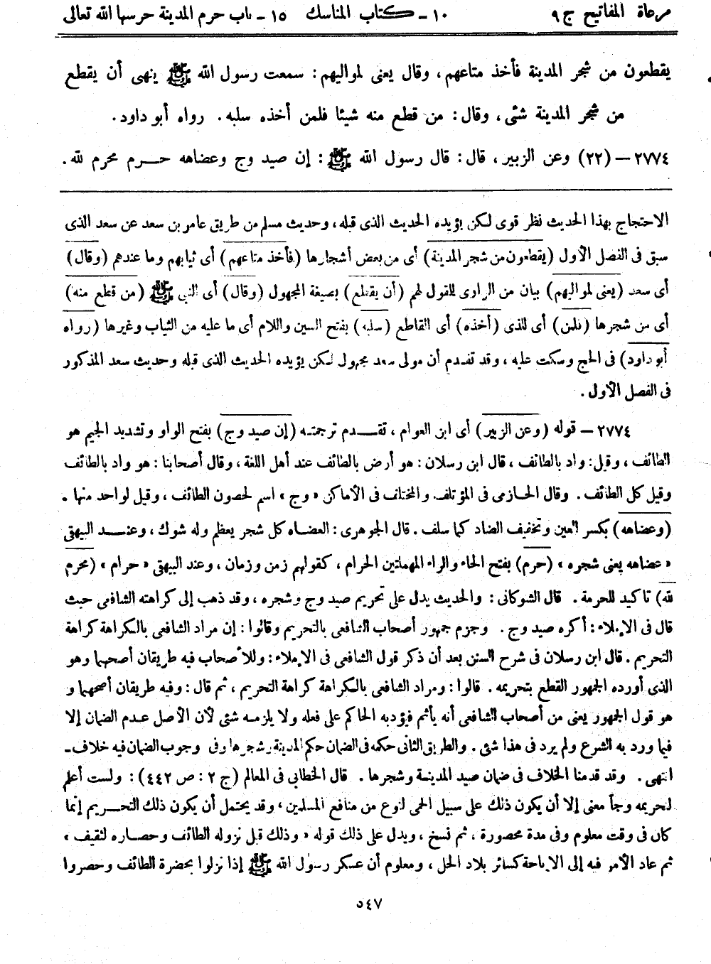 2774 – (22) وعن الزبير، قال: قال رسول الله - صلى الله عليه وسلم -: إن صيد وج وعضاهه حرم محرم لله.