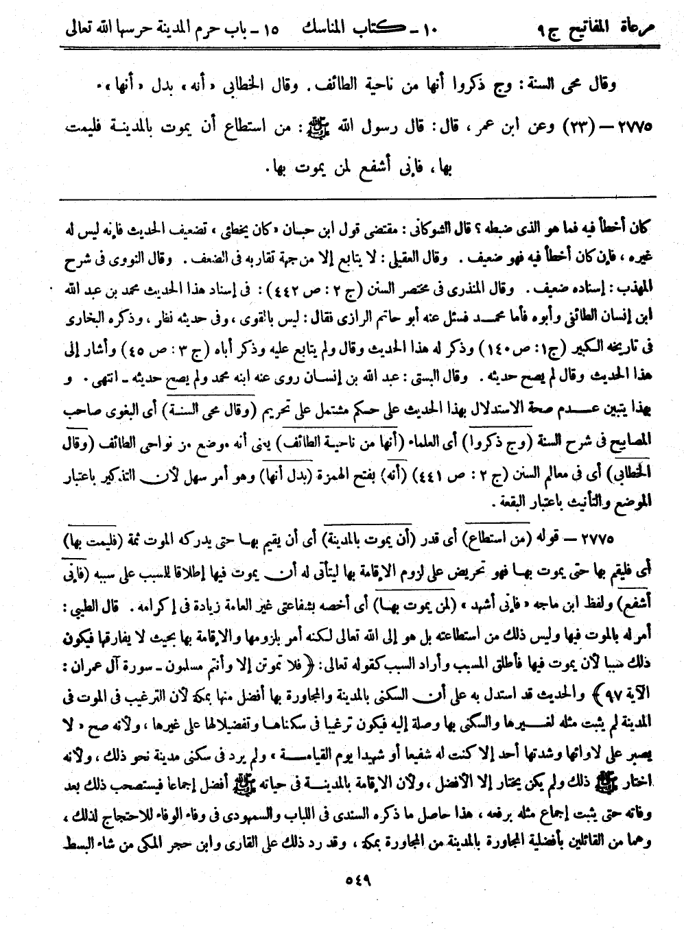 2775 – (23) وعن ابن عمر، قال: قال رسول الله - صلى الله عليه وسلم -: " من استطاع أن يموت بالمدينة فليمت بها، فإني أشفع لمن يموت بها ".