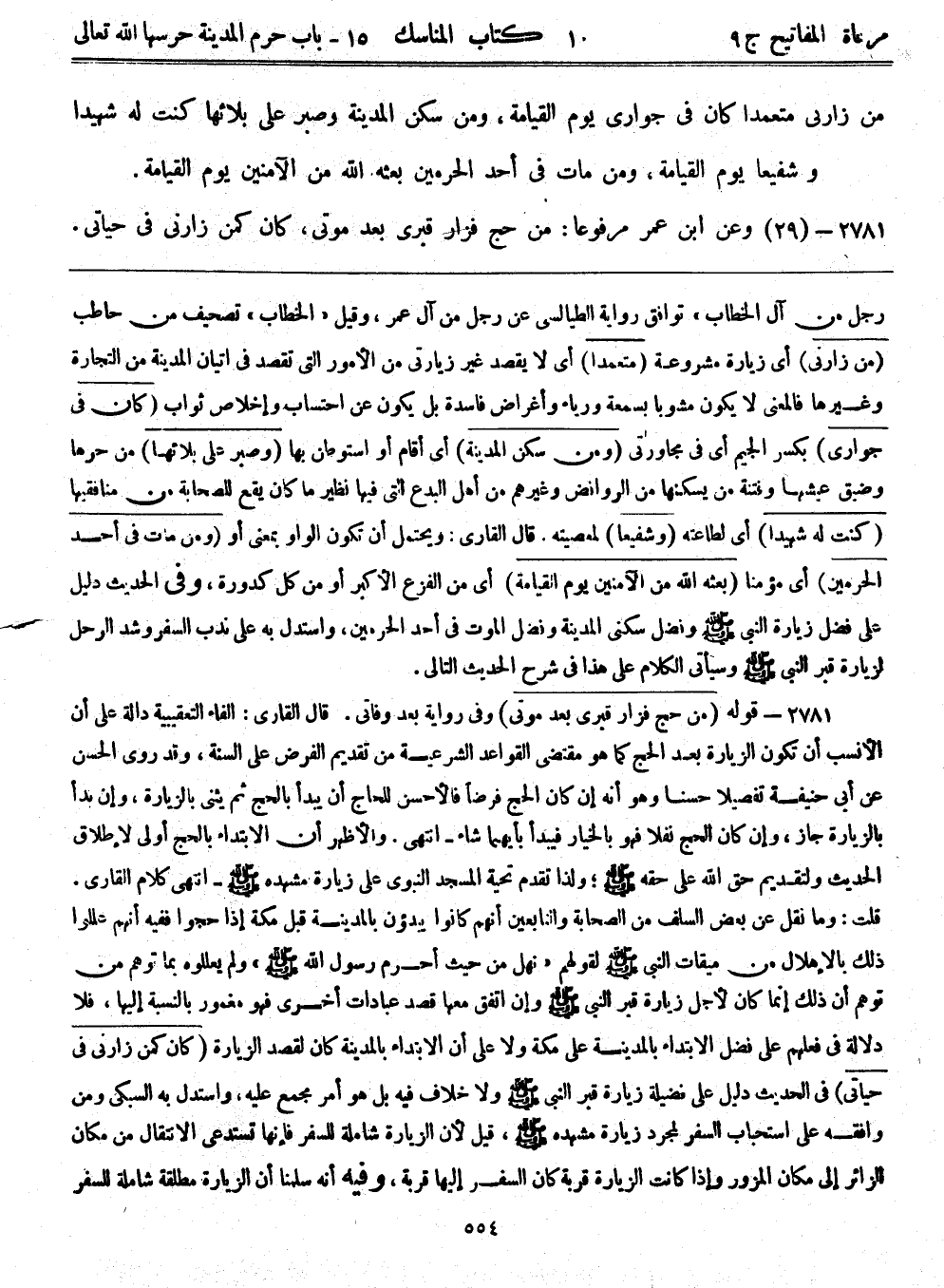 2781 - قوله (من حج فزار قبري بعد موتي) وفي رواية بعد وفاتي. قال القاري: الفاء التعقيبية دالة على أن الأنسب أن تكون الزيارة بعد الحج كما هو مقتضى القواعد الشرعية من تقديم الفرض على السنة، وقد روى الحسن عن أبي حنيفة تفصيلاً حسنًا وهو أنه إن كان الحج فرضًا فالأحسن للحاج أن يبدأ بالحج ثم يثنى بالزيارة، وإن بدأ بالزيارة جاز، وإن كان الحج نفلاً فهو بالخيار فيبدأ بأيهما شاء - انتهى. والأظهر أن الابتداء بالحج أولى لإطلاق الحديث ولتقديم حق الله على حقه - صلى الله عليه وسلم -؛ ولذا تقدم تحية المسجد النبوي على زيارة مشهده - صلى الله عليه وسلم - انتهى كلام القاري. قلت: وما نقل عن بعض السلف من الصحابة والتابعين أنهم كانوا يبدؤن بالمدينة قبل مكة إذا حجوا ففيه أنهم عللوا ذلك بالإهلال من ميقات النبي - صلى الله عليه وسلم - لقولهم ((نهل من حديث أحرم رسول الله - صلى الله عليه وسلم -)) ولم يعللوه بما توهم من توهم أن ذلك إنما كان لأجل زيارة قبر النبي - صلى الله عليه وسلم - وإن اتفق معها قصد عبادات أخرى فهو مغمور بالنسبة إليها، فلا دلالة في فعلهم على فضل الابتداء بالمدينة على مكة ولا على أن الابتداء بالمدينة كان لقصد الزيارة (كان كمن زارني في حياتي) في الحديث دليل على فضيلة زيارة قبر النبي - صلى الله عليه وسلم - ولا خلاف فيه بل هو أمر مجمع عليه، واستدل به السبكي ومن وافقه على استحباب السفر لمجرد زيارة مشهده - صلى الله عليه وسلم -، قيل لأن الزيارة شاملة للسفر فإنها تستدعي الانتقال من مكان الزائر إلى مكان المزور وإذا كانت الزيارة قربة كان السفر إليها قربة، وفيه أنه سلمنا أن الزيارة مطلقة شاملة للسفر