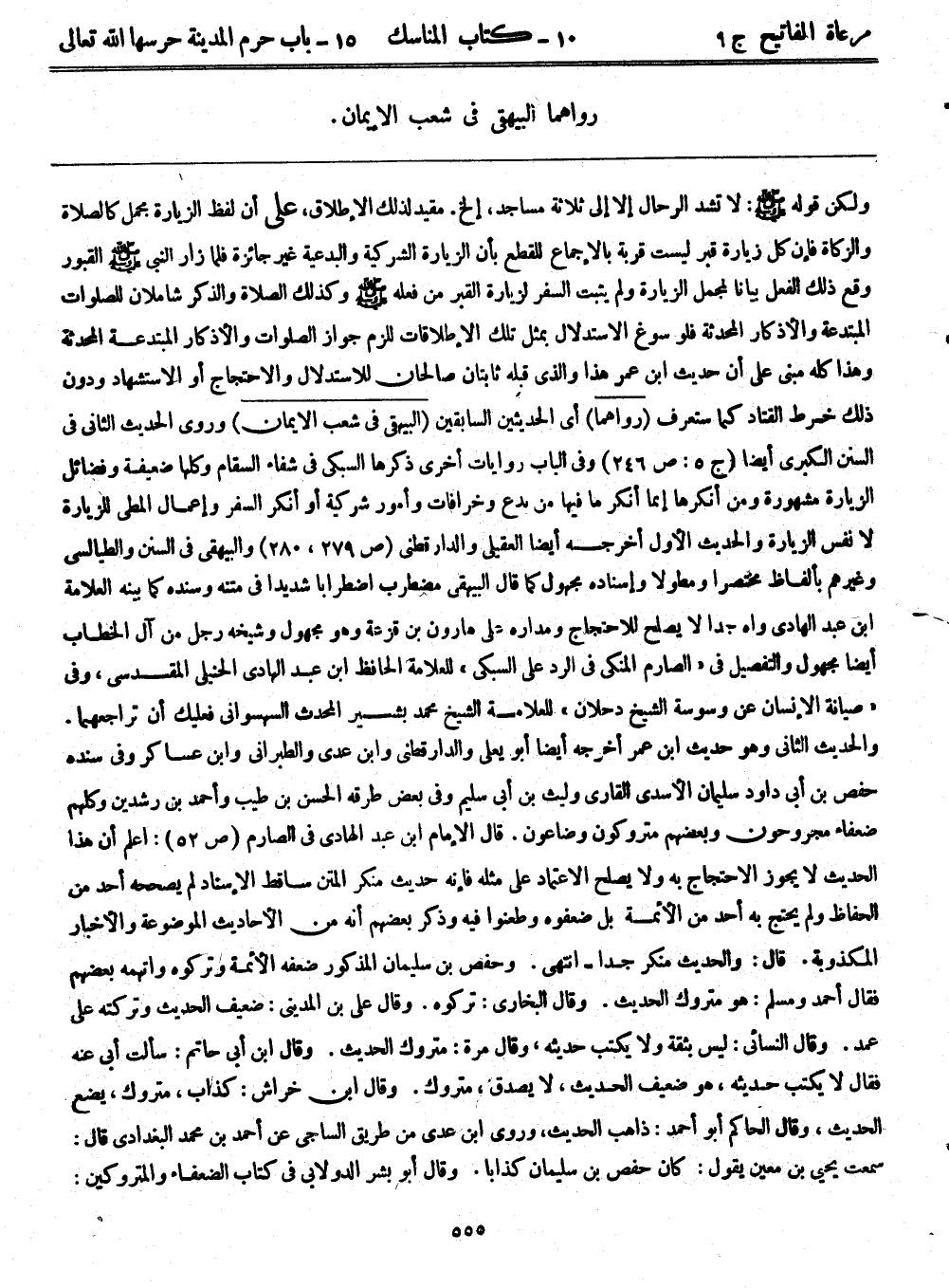 ولكن قوله - صلى الله عليه وسلم -: لا تشدوا الرحال إلا إلى ثلاثة مساجد، إلخ. مقيد لذلك الإطلاق، على أن لفظ الزيارة مجمل كالصلاة والزكاة فإن كل زيارة قبر ليست قربة بالإجماع للقطع بأن الزيارة الشركية والبدعية غير جائزة فلما زار النبي - صلى الله عليه وسلم - القبور وقع ذلك الفعل بيانًا لمجمل الزيارة ولم يثبت السفر لزيارة القبر من فعله - صلى الله عليه وسلم - وكذلك الصلاة والذكر شاملان للصلوات المبتدعة والأذكار المحدثة فلو سوغ الاستدلال بمثل تلك الإطلاقات للزم جواز الصلوات والأذكار المبتدعة المحدثة وهذا كله مبني على أن حديث ابن عمر هذا والذي قبله ثابتان صالحان للاستدلال والاحتجاج أو الاستشهاد ودون ذلك خرط القتاد كما ستعرف (رواهما) أي الحديثين السابقين (البيهقي في شعب الإيمان) وروى الحديث الثاني في السنن الكبري أيضًا (ج 5: ص 246) وفي الباب روايات أخرى ذكرها السبكي في شفاء السقام وكلها ضعيفة وفضائل الزيادة مشهورة ومن أنكرها إنما أنكر ما فيها من بدع وخرافات وأمور شركية أو أنكر السفر وإعمال المطي للزيارة لا نفس الزيارة والحديث الأول أخرجه أيضًا العقيلي والدارقطني (ص 279، 280) والبيهقي في السنن والطيالسي وغيرهم بألفاظ مختصرًا ومطولاً وإسناده مجهول كما قال البيهقي مضطرب اضطراباً شديداً في متنه وسنده كما بينه العلامة ابن عبد الهادي واه جدًا لا يصلح للاحتجاج ومداره على هارون بن قزعة وهو مجهول وشيخه رجل من آل الخطاب أيضًا مجهول والتفصيل في ((الصارم المنكي في الرد على السبكي)) للعلامة الحافظ ابن عبد الهادي الحنبلي المقدسي، وفي ((صيانة الإنسان عن وسوسة الشيخ دحلان)) للعلامة الشيخ محمد بشير المحدث السهسواني فعليك أن تراجعهما. والحديث الثاني وهو حديث ابن عمر أخرجه أيضًا أبو يعلى والدارقطني وابن عدي والطبراني وابن عساكر وفي سنده حفص بن أبي داود سليمان الأسدي القاري وليث بن أبي سليم وفي بعض طرقه الحسن بن طيب وأحمد بن رشدين وكلهم ضعفاء مجروحون وبعضهم متروكون وضاعون. قال الإمام ابن عبد الهادي في الصارم - صلى الله عليه وسلم - (52) : اعلم أن هذا الحديث لا يجوز الاحتجاج به ولا يصلح الاعتماد على مثله فإنه حديث منكر المتن ساقط الإسناد لم يصححه أحد من الحفاظ ولم يحتج به أحد من الأئمة بل ضعفوه وطعنوا فيه وذكر بعضهم أنه من الأحاديث الموضوعة والأخبار المكذوبة. قال: والحديث منكر جدًا – انتهى. وحفص بن سليمان المذكور ضعفه الأئمة وتركوه واتهمه بعضهم فقال أحمد ومسلم: هو متروك الحديث. وقال البخاري: تركوه. وقال علي بن المديني: ضعيف الحديث وتركته على عمد. وقال النسائي: ليس بثقة ولا يكتب حديثه، وقال مرة: متروك الحديث. وقال ابن أبي حاتم: سألت أبي عنه فقال: لا يكتب حديثه، وهو ضعيف الحديث، لا يصدق، متروك. وقال ابن خراش: كذاب، متروك، يضع الحديث، وقال الحاكم أبو أحمد: ذاهب الحديث، وروى ابن عدي من طريق الساجي عن أحمد بن محمد البغدادي قال: سمعت يحيى بن معين يقول: كان حفص بن سليمان كذابًا. وقال أبو بشر الدولابي في كتاب الضعفاء والمتروكين: