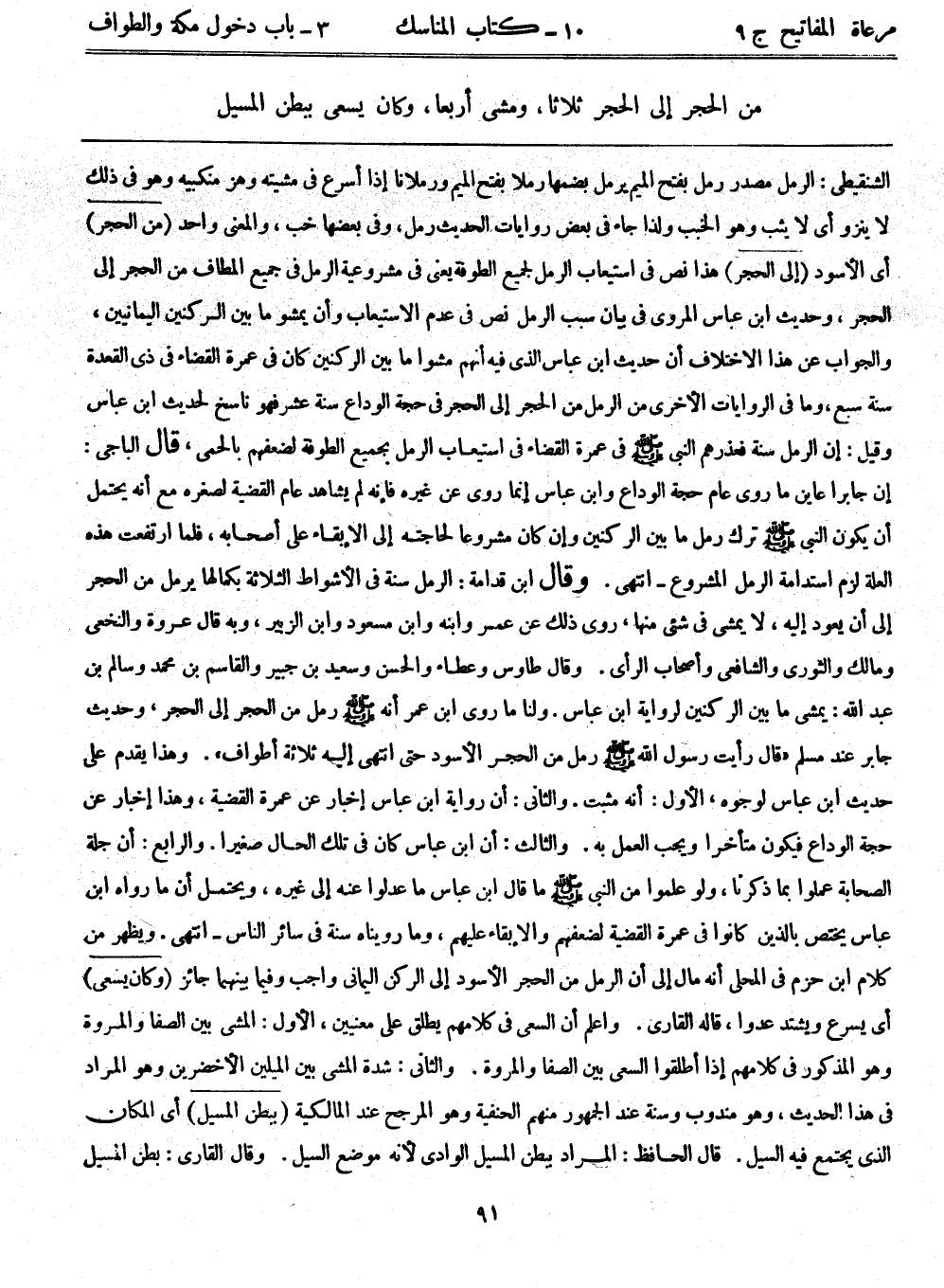الشنقيطي: الرمل مصدر رمَل بفتح الميم يرمُل بضمها رمَلاً بفتح الميم ورملانًا إذا أسرع في مشيته وهز منكبيه وهو في ذلك لا ينزو أي لا يثب وهو الخبب، ولذا جاء في بعض روايات الحديث رمل، وفي بعضها خبّ، والمعنى واحد (من الحجر) أي الأسود (إلى الحجر) هذا نص في استيعاب الرمل لجميع الطوفة يعني في مشروعية الرمل في جميع المطاف من الحجر إلى الحجر، وحديث ابن عباس المروي في بيان سبب الرمل نص في عدم الاستيعاب وأن يمشوا ما بين الركنين اليمانيين، والجواب عن هذا الاختلاف أن حديث ابن عباس الذي فيه أنهم مشوا ما بين الركنين كان في عمرة القضاء في ذي القعدة سنة سبع، وما في الروايات الأخرى من الرمل من الحجر إلى الحجر في حجة الوداع سنة عشر فهو ناسخ لحديث ابن عباس وقيل إن الرمل سنة فعذرهم النبي - صلى الله عليه وسلم - في عمرة القضاء في استيعاب الرمل بجميع الطوفة لضعفهم بالحمى، قال الباجي: إن جابراً عاين ما روى عام حجة الوداع وابن عباس إنما روى عن غيره فإنه لم يشاهد عام القضية لصغره مع أنه يحتمل أن يكون النبي - صلى الله عليه وسلم - ترك رمل ما بين الركنين وإن كان مشروعاً لحاجته إلى الإبقاء على أصحابه، فلما ارتفعت هذه العلة لزم استدامة الرمل المشروع – انتهى. وقال ابن قدامة: الرمل سنة في الأشواط الثلاثة بكمالها يرمل من الحجر إلى أن يعود إليه، لا يمشي في شيء منها، روى ذلك عن عمر وابنه وابن مسعود وابن الزبير، وبه قال عروة والنخعي ومالك والثوري والشافعي وأصحاب الرأي. وقال طاوس وعطاء والحسن وسعيد بن جبير والقاسم بن محمد وسالم بن عبد الله: يمشي ما بين الركنين لرواية ابن عباس. ولنا ما روى ابن عمر أنه - صلى الله عليه وسلم - رمل من الحجر إلى الحجر، وحديث جابر عند مسلم " قال: رأيت رسول الله - صلى الله عليه وسلم - رمل من الحجر الأسود حتى انتهى إليه ثلاثة أطواف ". وهذا يقدم على حديث ابن عباس لوجوه، الأول: أنه مثبت. والثاني: أن رواية ابن عباس إخبار عن عمرة القضية، وهذا إخبار عن حجة الوداع فيكون متأخرًا ويجب العمل به. والثالث: أن ابن عباس كان في تلك الحال صغيرًا. والرابع: أن جلة الصحابة عملوا بما ذكرنا، ولو علموا من النبي - صلى الله عليه وسلم - ما قال ابن عباس ما عدلوا عنه إلى غيره، ويحتمل أن ما رواه ابن عباس يختص بالذين كانوا في عمرة القضية لضعفهم والإبقاء عليهم، وما رويناه سنة في سائر الناس – انتهى. ويظهر من كلام ابن حزم في المحلى أنه مال إلى أن الرمل من الحجر الأسود إلى الركن اليماني وفيما بينهما جائز (وكان يسعى) أي يسرع ويشتد عدوًا، قاله القاري. واعلم أن السعي في كلامهم يطلق على معنيين، الأول: المشي بين الصفا والمروة وهو المذكور في كلامهم إذا أطلقوا السعي بين الصفا والمروة. والثاني: شدة المشي بين الميلين الأخضرين وهو المراد في هذا الحديث، وهو مندوب وسنة عند الجمهور، منهم الحنفية وهو المرجح عند المالكية (ببطن المسيل) أي المكان الذي يجتمع فيه السيل. قال الحافظ: المراد ببطن المسيل الوادي لأنه موضع السيل. وقال القاري بطن المسيل