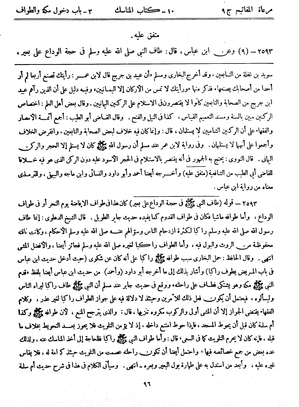 2593 - (9) وعن ابن عباس، قال: طاف النبي - صلى الله عليه وسلم - في حجة الوداع على بعير،