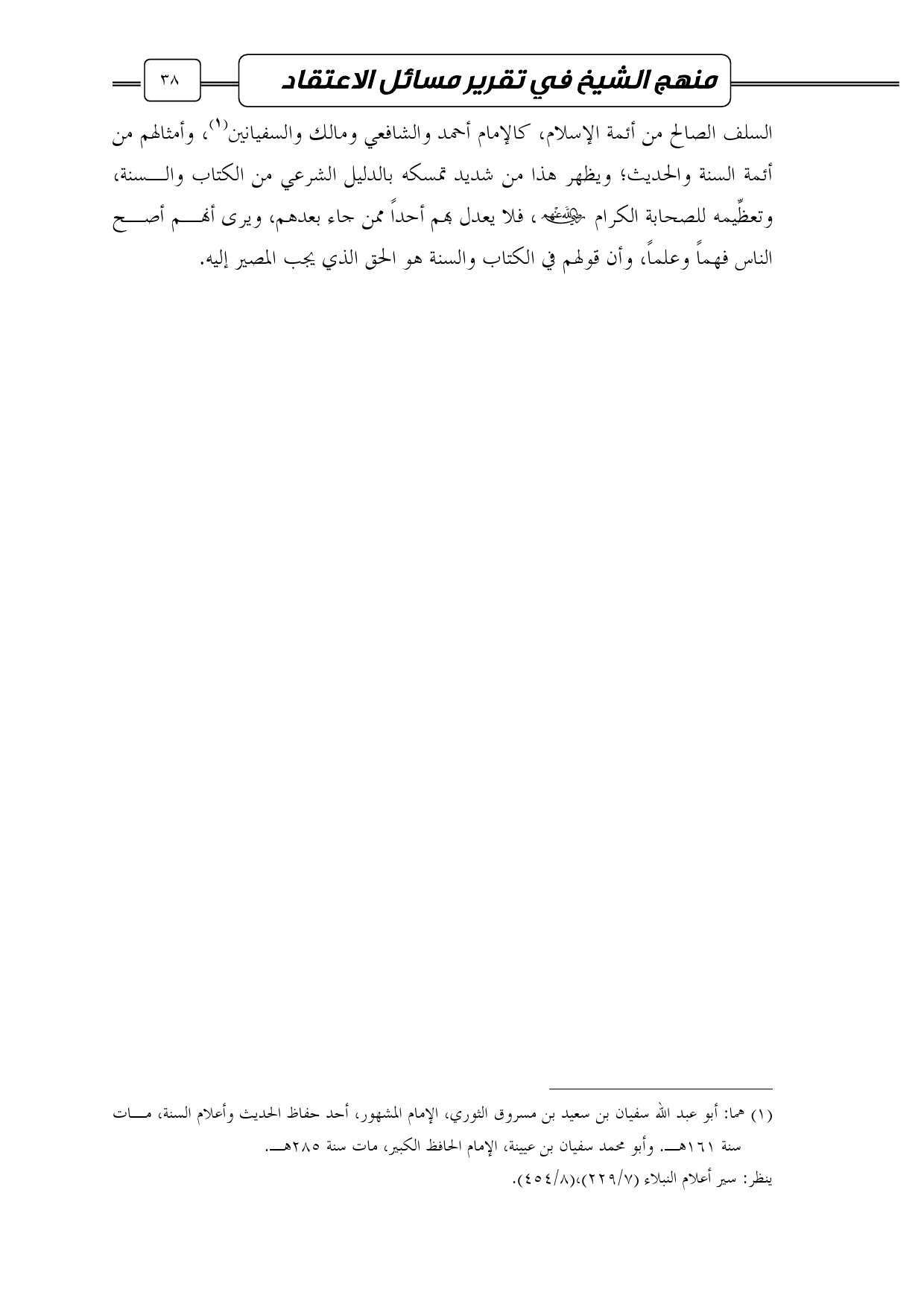 السلف الصالح من أئمة الإسلام، كالإمام أحمد والشافعي ومالك والسفيانين (¬1)، وأمثالهم من أئمة السنة والحديث؛ ويظهر هذا من شديد تمسكه بالدليل الشرعي من الكتاب والسنة، وتعظِّيمه للصحابة الكرام - رضي الله عنهم -، فلا يعدل بهم أحداً ممن جاء بعدهم، ويرى أنهم أصح الناس فهماً وعلماً، وأن قولهم في الكتاب والسنة هو الحق الذي يجب المصير إليه.