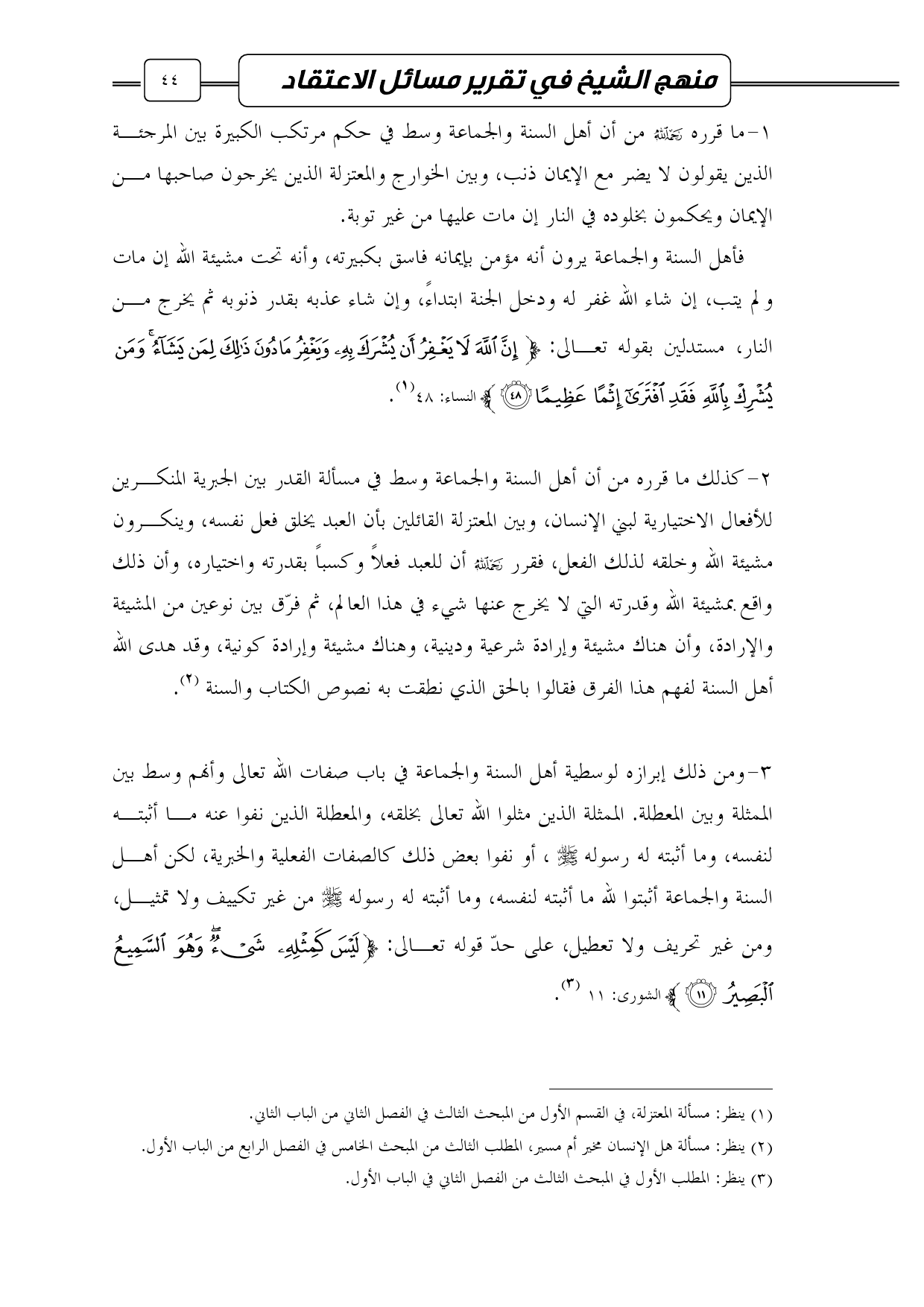 1 - ما قرره: من أن أهل السنة والجماعة وسط في حكم مرتكب الكبيرة بين المرجئة الذين يقولون لا يضر مع الإيمان ذنب، وبين الخوارج والمعتزلة الذين يخرجون صاحبها من الإيمان ويحكمون بخلوده في النار إن مات عليها من غير توبة.