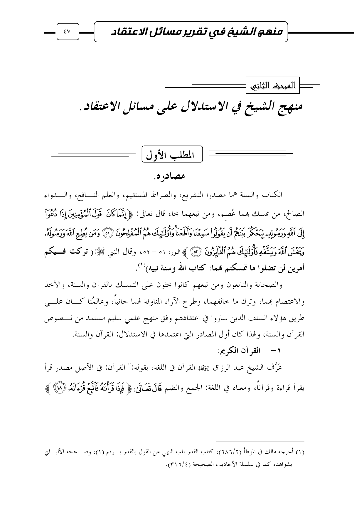 منهج الشيخ في الاستدلال على مسائل الاعتقاد.