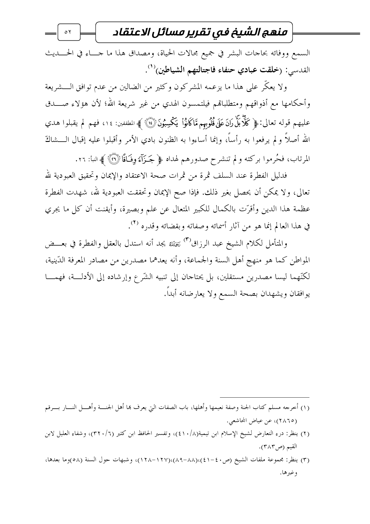 السمع ووفائه بحاجات البشر في جميع مجالات الحياة، ومصداق هذا ما جاء في الحديث القدسي: (خلقت عبادي حنفاء فاجتالتهم الشياطين) (¬1).