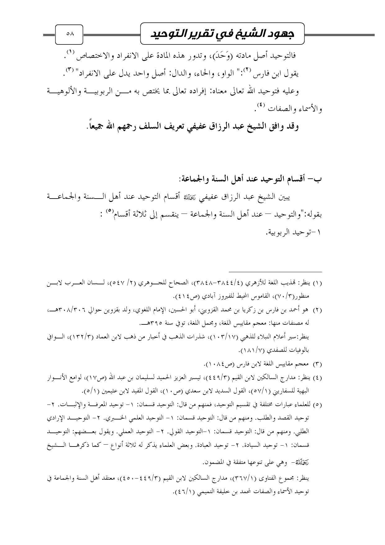 (¬5) للعلماء عبارات مختلفة في تقسيم التوحيد، فمنهم من قال: التوحيد قسمان: