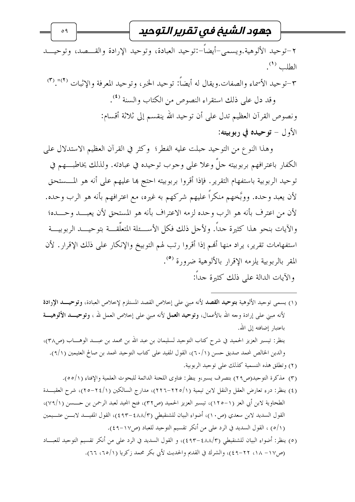 (¬4) ينظر: درء تعارض العقل والنقل لابن تيمية (1/ 225 - 226)، مدارج السالكين (1/ 24 - 25)، شرح العقيدة الطحاوية لابن أبي العز (1 - 125)، تيسير العزيز الحميد (ص 32)، فتح المجيد لعبد الرحمن بن حسن (1/ 79)، القول السديد لابن سعدي (ص 10)، أضواء البيان للشنقيطي (3/ 488 - 493)، القول المفيد لابن عثيمين (1/ 5)، القول السديد في الرد على من أنكر تقسيم التوحيد للعباد (ص 17 - 49).