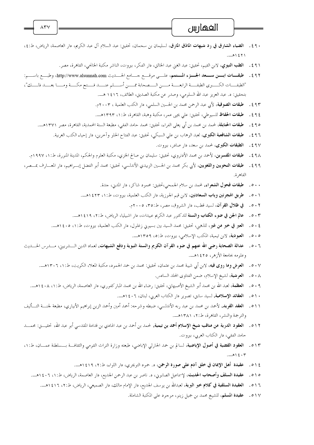 512 - العقود الدرية من مناقب شيخ الإسلام أحمد بن تيمية، لمحمد بن أحمد بن عبد الهادي بن قدامة المقدسي أبو عبد الله، تحقيق: محمد حامد الفقي، دار الكتاب العربي، بيروت.