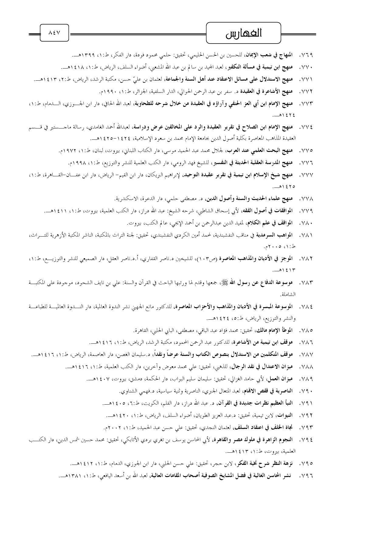 793 - نجاة الخلف في اعتقاد السلف، لعثمان النجدي، تحقيق: علي حسن عبد الحميد، ط:1، 2002 م.