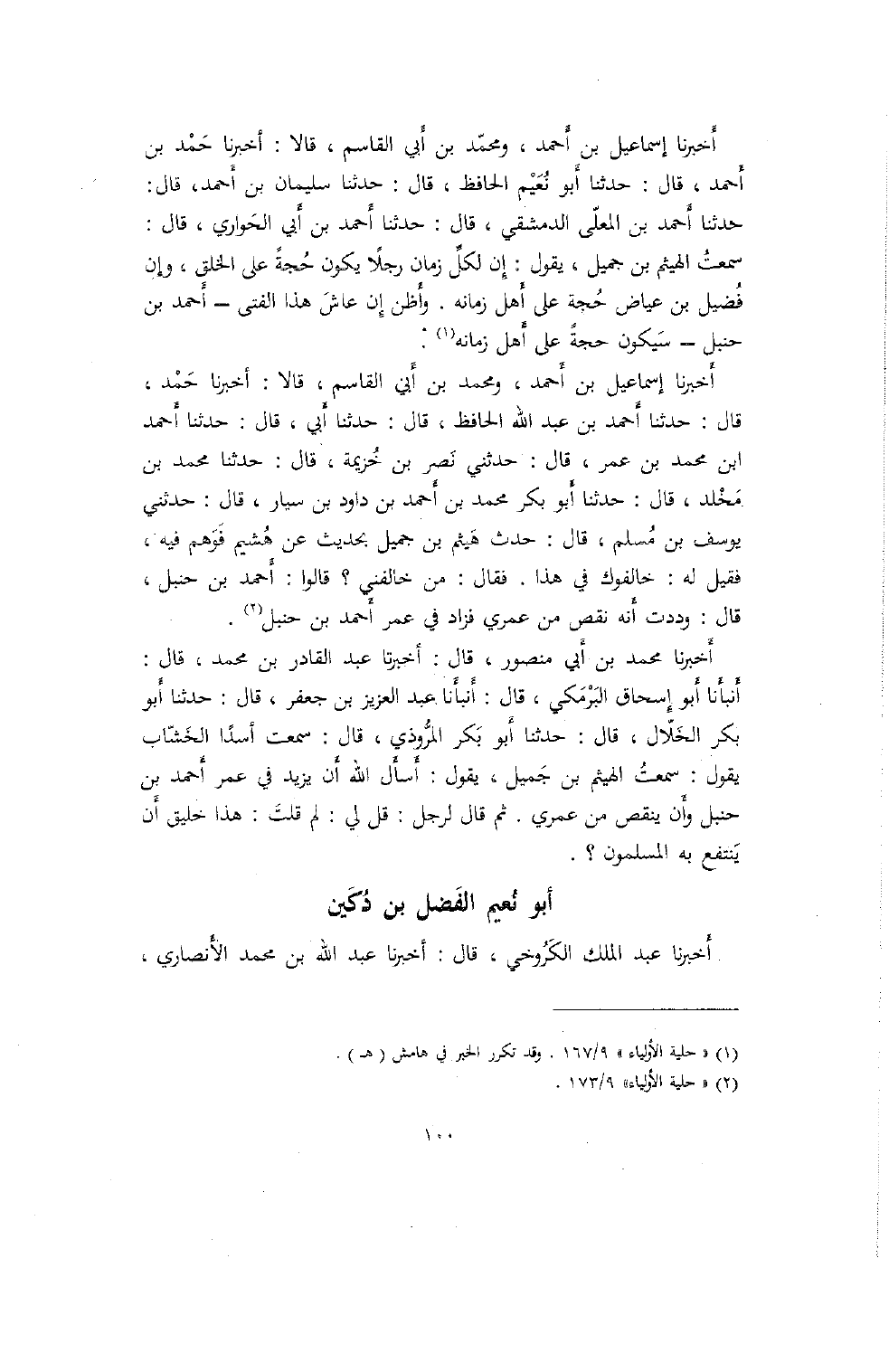 أَخبرنا إسماعيل بن أَحمد، ومحمَد بن أَبي القاسم، قالا: أخبرنا حَمْد بن أَحمد، قال: حدثنا أَبو نُعَيْم الحافظ، قال: حدثنا سليمان بن أَحمد، قال: حدثنا أَحمد بن المعلّى الدمشقي، قال: حدثنا أَحمد بن أَبي الحواري، قال: سمعتُ الهيثم بن جميل، يقول: إِن لكلِّ زمان رجلاً يكون حُجةً على الخلق، وإِن فُضيل بن عياض حُجة على أَهل زمانه. وأَظن إِن عاشَ هذا الفتى- أَحمد بن حنبل- سَيكون حجةً على أَهل زمانه.