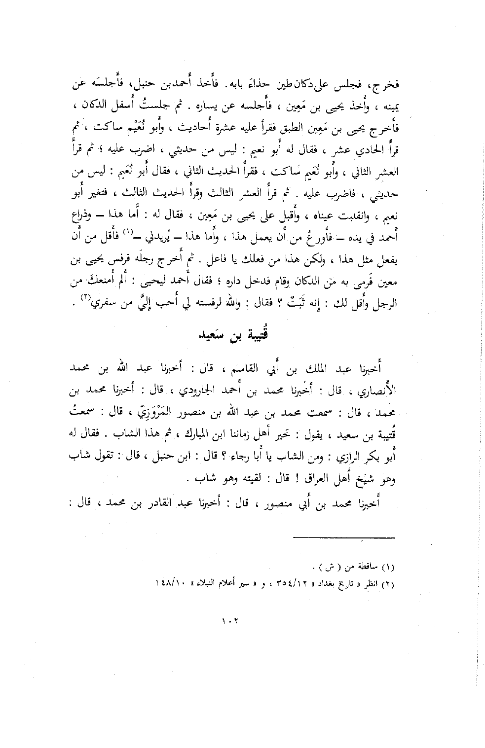 أَخبرنا عبد الملك بن أَبي القاسم، قال: أخبرنا عبد الله بن محمد الأَنصاري، قال: أخبرنا محمد بن أحمد الجارودي، قال: أخبرنا محمد بن محمد، قال: سمعت محمد بن عبد الله بن عبد الله بن منصور المَرْوَزِيّ، قال: سمعتُ قُتيبة بن سعيد، يقول: خَير أهل زماننا ابن المبارك، ثم هذا الشاب. فقال له أَبو بكر الرازي: ومن الشاب يا أَبا رجاء؟ قال: ابن حنبل، قال: تقول شاب وهو شيخ أَهل العراق! قال: لقيته وهو شاب.