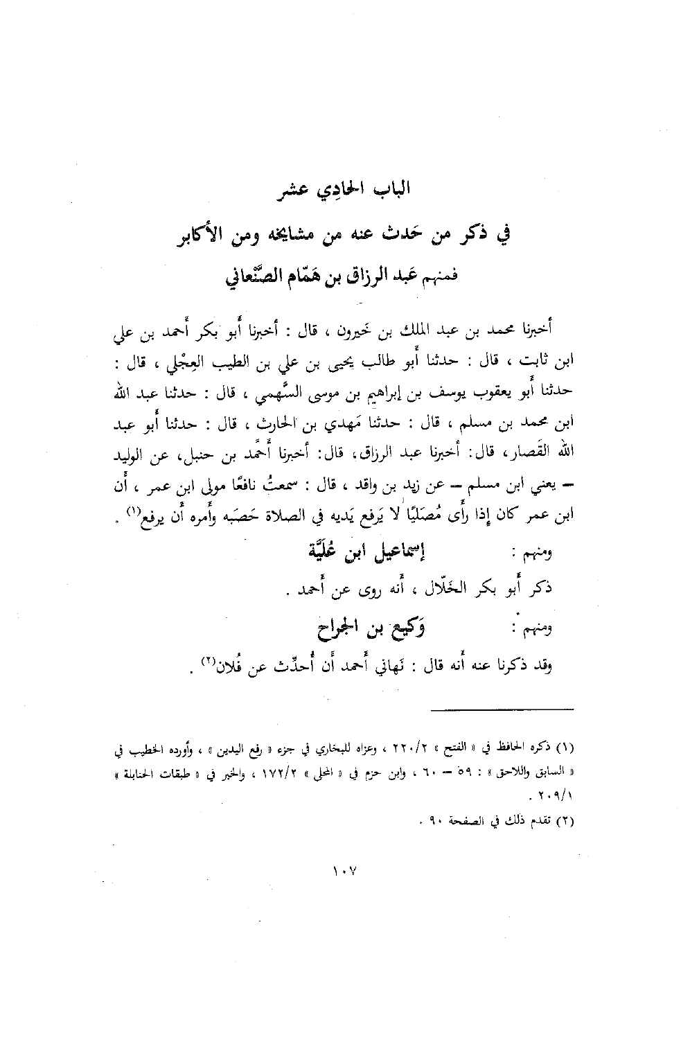 أخبرنا محمد بن عبد الملك بن خَيرون، قال: أخبرنا أَبو بكر أَحمد بن علي ابن ثابت، قال: حدثنا أَبو طالب يحيى بن علي بن الطيب العِجْلي، قال: حدثنا أَبو يعقوب يوسف بن إبراهيم بن موسى السَّهمي، قال: حدثنا عبد الله بن محمد بن مسلم، قال: حدثنا مَهدي بن الحارث، قال: حدثنا أَبو عبد الله القَصار، قال: أخبرنا عبد الرزاق، قال: أخبرنا أَحْمد بن حنبل، عن الوليد- يعني ابن مسلم- عن زيد بن واقد، قال: سمعتُ نافعاً مولى ابن عمر، أَن ابن عمر كان إِذا رأَى مُصَلياً لا يَرفع يَديه في الصلاة حَصبَه وأَمره أَن يرفع.