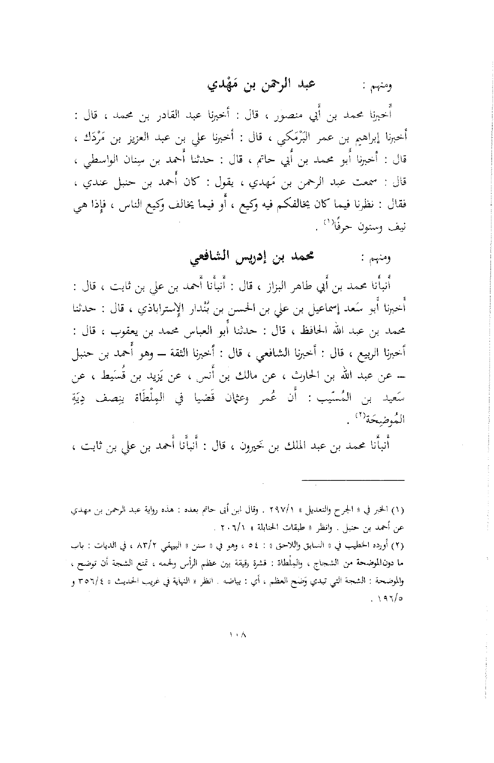 أنبأَنا محمد بن أَبي طاهر البزاز، قال: أنبأَنا أَحمد بن علي بن ثابت، قال: أَخبرنا أَبو سَعد إِسماعيل بن علي بن الحسن بن بُنْدار الإِستراباذي، قال: حدثنا محمد بن عبد الله الحافظ، قال: حدثنا أَبو العباس محمد بن يعقوب، قال: أخبرنا الربيع، قال: أخبرنا الشافعي، قال: أخبرنا الثقة- وهو أَحمد بن حنبل- عن عبد الله بن الحارث، عن مالك بن أنس، عن يَزيد بن قُسَيط، عن سَعيد بن المُسيّب: أَن عُمر وعثمان قَضيا في المِلْطَاة بنِصف دِيَةِ المُوضِحَة.