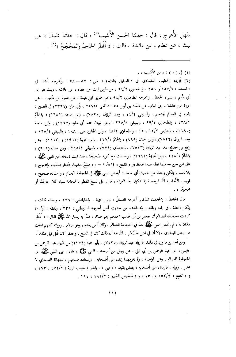 سَهل الأَعرج، قال: حدثنا الحسن الأَشيب، قال: حدثنا شَيبان، عن ليث، عن عطاء، عن عائشة، قالت: "أَفْطَرَ الحاجمُ والمَحْجُومُ".