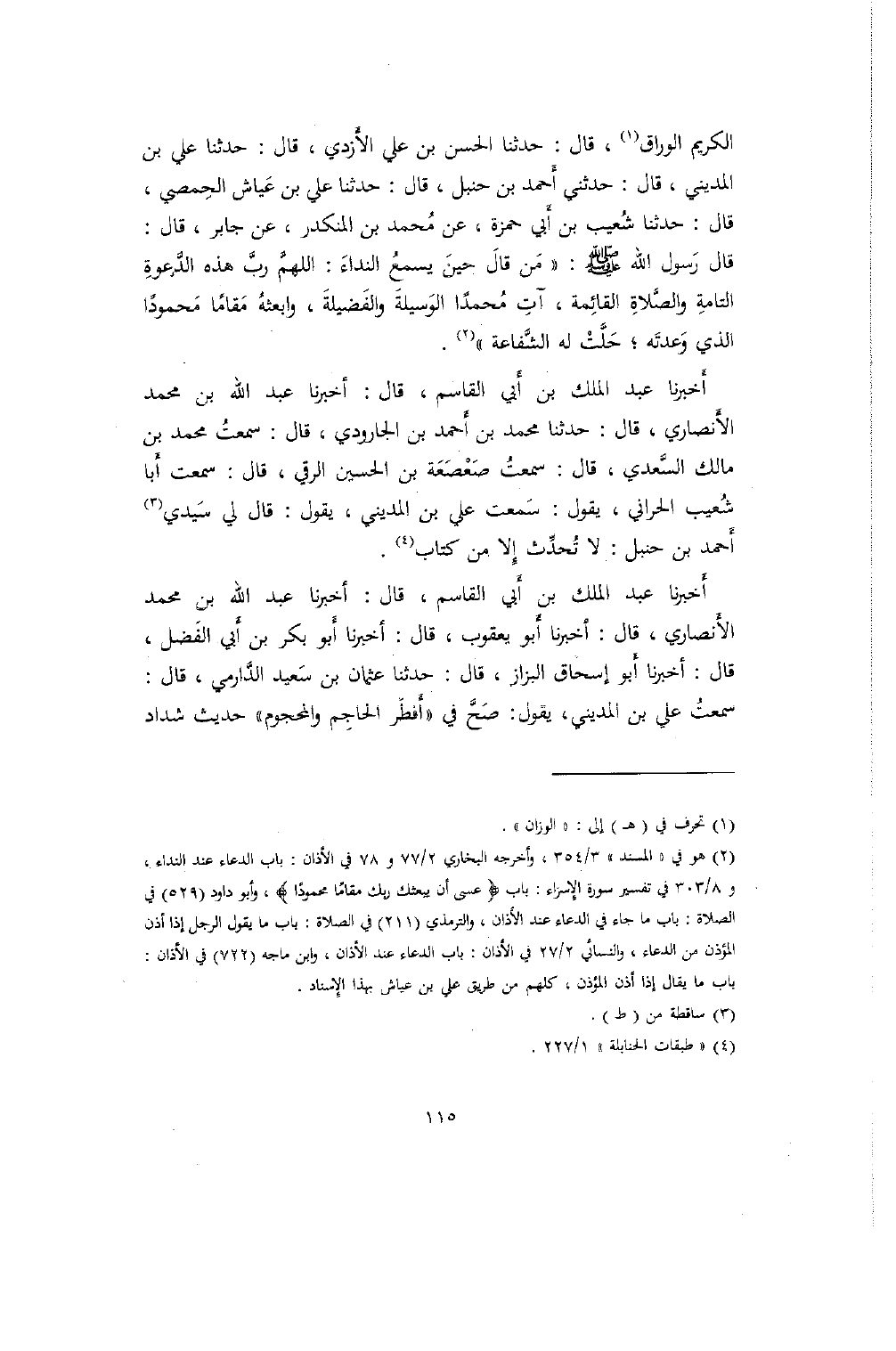 الكريم الوراق، قال: حدثنا الحسن بن علي الأَزدي، قال: حدثنا علي بن المديني، قال: حدثني أَحمد بن حنبل، قال: حدثنا علي بن عَياش الحِمصي، قال: حدثنا شُعيب بن أَبي حمزة، عن مُحمد بن المنكدر، عن جابر، قال: قال رَسول الله صلى الله عليه وسلم: "مَن قالَ حينَ يسمعُ النداءَ: اللهمَّ ربَّ هذه الدَّعوةِ التامةِ والصَّلاةِ القائِمة، آتِ مُحمداً الوَسيلةَ والفَضيلةَ، وابعثهُ مَقاماً مَحموداً الذي وَعدتَه؛ حَلَّتْ له الشَّفاعة".