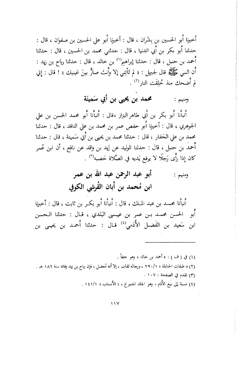 أَنبأَنا محمد بن عبد الملك، قال: أَنبأَنا أَبو بكر بن ثابت، قال: أخبرنا أَبو الحسن محمد بن عمر بن عيسى البَلدي، قال: حدثنا الحسن ابن سَعيد بن الفَضل الأَدَمي قال: حدثنا أَحمد بن يحيى بن