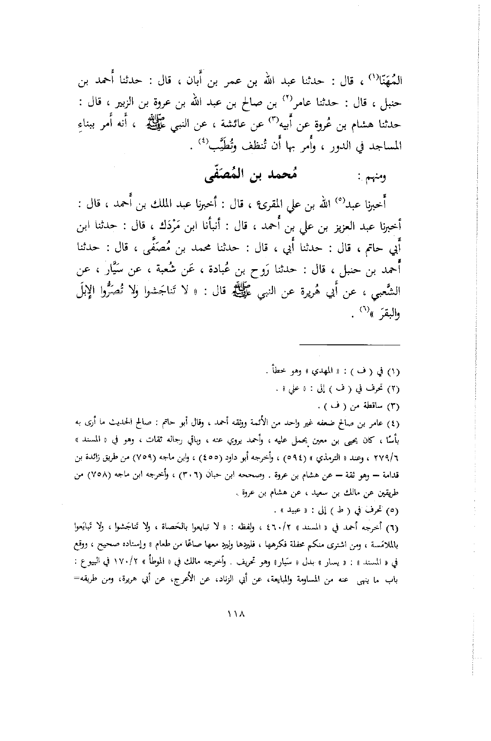 أَخبرنا عبد الله بن علي المقرئ، قال: أخبرنا عبد الملك بن أَحمد، قال: أخبرنا عبد العزيز بن علي بن أَحمد، قال: أنبأنا ابن مَرْدَك، قال: حدثنا ابن أَبي حاتم، قال: حدثنا أَبي، قال: حدثنا محمد بن مُصَفَّى، قال: حدثنا أَحمد بن حنبل، قال: حدثنا رَوح بن عُبادة، عَن شُعبة، عن سَيَّار، عن الشَّعبي، عن أَبي هُريرة عن النبي صلى الله عليه وسلم قال: "لا تَناجَشوا ولا تُصَرُّوا الإِبلَ والبقرَ".