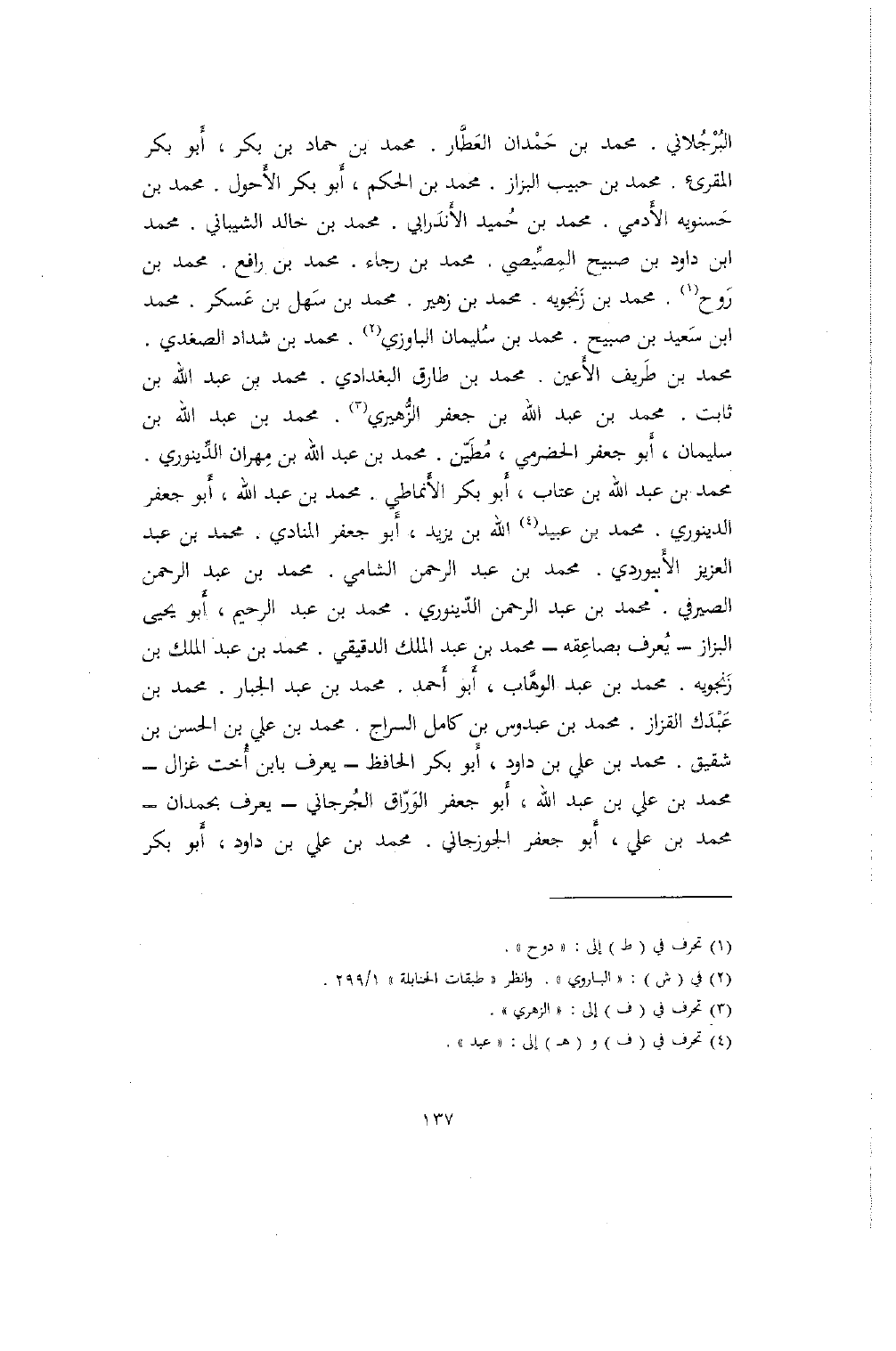 البُرْجُلاني. محمد بن حَمْدان العَطَّار. محمد بن حماد بن بكر، أَبو بكر المقرئ. محمد بن حبيب البزاز. محمد بن الحكم، أَبو بكر الأَحول. محمد بن حَسنويه الأَدمي. محمد بن حُميد الأَندَرابي. محمد بن خالد الشيباني. محمد ابن داود بن صبيح المِصِّيصي. محمد بن رجاء. محمد بن رافع. محمد بن رَوح. محمد بن زَنجويه. محمد بن زهير. محمد بن سَهل بن عَسكر. محمد ابن سَعيد بن صبيح. محمد بن سُليمان الباوزي. محمد بن شداد الصغدي. محمد بن طَريف الأَعين. محمد بن طارق البغدادي. محمد بن عبد الله بن ثابت. محمد بن عبد الله بن جعفر الزُّهيري. محمد بن عبد الله بن سليمان، أبو جعفر الحضرمي، مُطَيّن. محمد بن عبد الله بن مِهران الدِّينوري. محمد بن عبد الله بن عتاب، أَبو بكر الأنماطي. محمد بن عبد الله، أَبو جعفر الدينوري. محمد بن عبيد الله بن يزيد، أَبو جعفر المنادي. محمد بن عبد العزيز أَبيوردي. محمد بن عبد الرحمن الشامي. محمد بن عبد الرحمن الصيرفي. محمد بن عبد الرحمن الدّينوري. محمد بن عبد الرحيم، أَبو يحيى البزاز- يُعرف بصاعِقه- محمد بن عبد الملك الدقيقي. محمد بن عبد الملك بن زَنجويه. محمد بن عبد الوهَّاب، أَبو أَحمد. محمد بن عبد الجبار. محمد بن عَبْدَك القزاز. محمد بن عبدوس بن كامل السراج. محمد بن علي بن الحسن بن شقيق. محمد بن علي بن داود، أَبو بكر الحافظ- يعرف بابن أُخت غزال- محمد بن علي بن عبد الله، أَبو جعفر الوَرّاق الجُرجاني- يعرف بحمدان- محمد بن علي، أَبو جعفر الجوزجاني. محمد بن علي بن داود، أَبو بكر