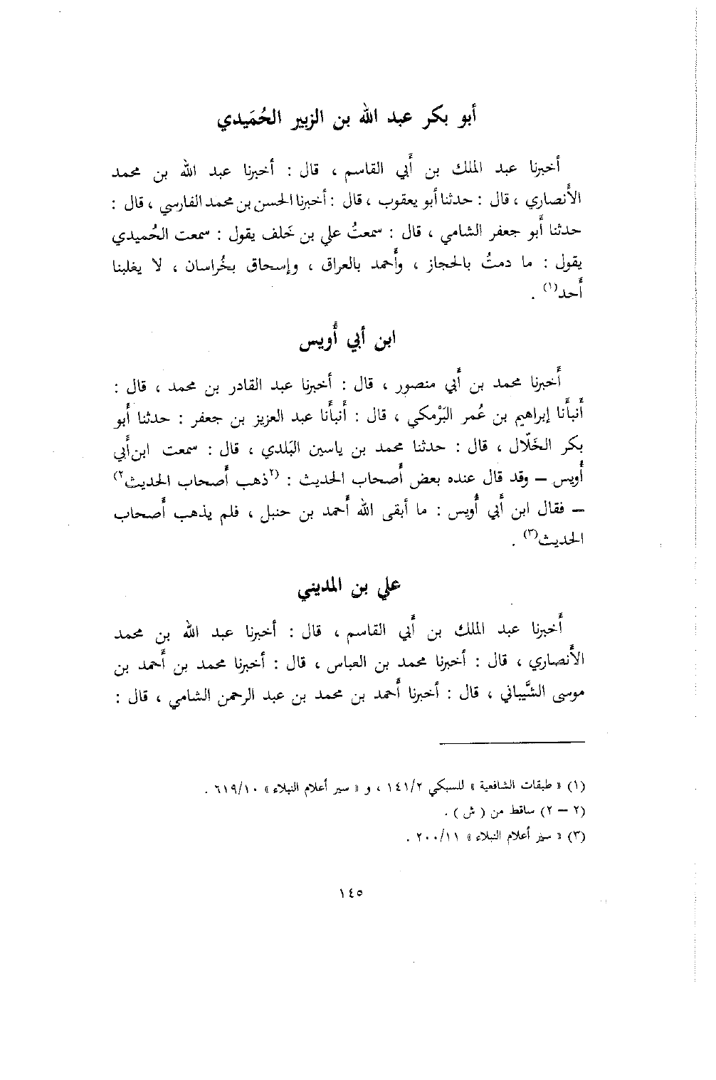 أخبرنا عبد الملك بن أَبي القاسم، قال: أخبرنا عبد الله بن محمد الأنصاري، قال: حدثنا أبو يعقوب، قال: أخبرنا الحسن بن محمد الفارسي، قال: حدثنا أَبو جعفر الشامي، قال: سمعتُ علي بن خَلف يقول: سمعت الحُميدي يقول: ما دمتُ بالحجاز، وأَحمد بالعراق، وإسحاق بخُراسان، لا يغلبنا أَحد.