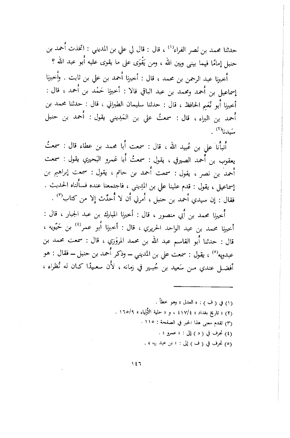 أَخبرنا عبد الرحمن بن محمد، قال: أخبرنا أَحمد بن علي بن ثابت. وأَخبرنا إسماعيل بن أَحمد ومحمد بن عبد الباقي قالا: أخبرنا حَمْد بن أَحمد، قال: أخبرنا أَبو نُعَيم الحافظ، قال: حدثنا سليمان الطبراني، قال: حدثنا محمد بن أَحمد بن البراء، قال: سمعتُ علي بن المَدِيني يقول: أحمد بن حنبل سَيدنا.