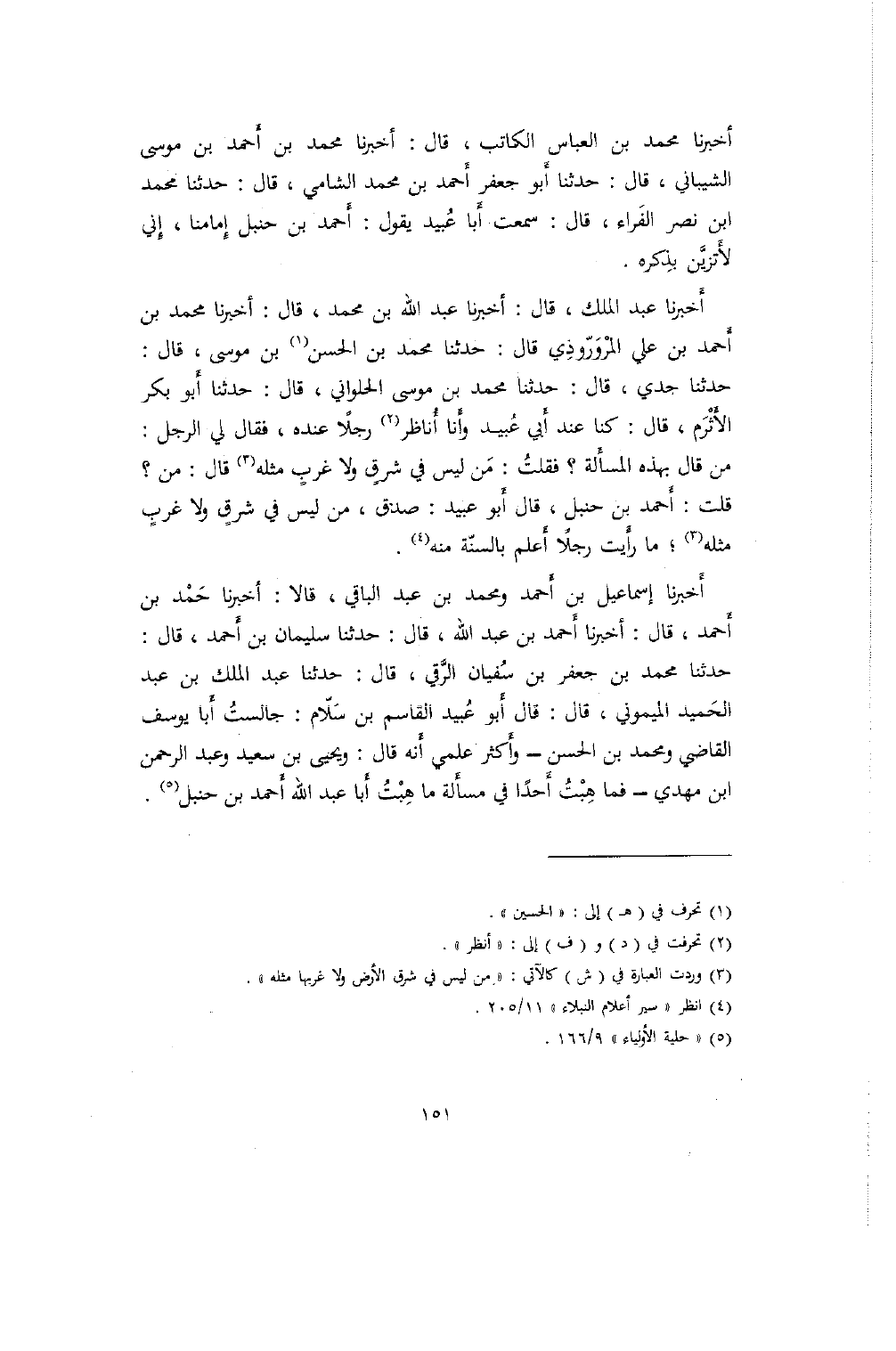 أخبرنا محمد بن العباس الكاتب، قال: أخبرنا محمد بن أَحمد بن موسى الشيباني، قال: حدثنا أَبو جعفر أَحمد بن محمد الشامي، قال: حدثنا محمد ابن نصر الفَراء، قال: سمعت أَبا عُبيد يقول: أَحمد بن حنبل إِمامنا، إِني لأَتزيَّن بذِكره.