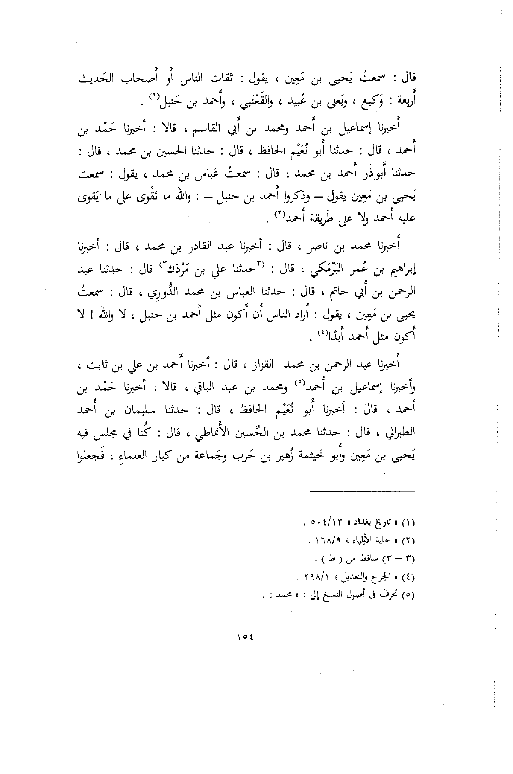 أَخبرنا إِسماعيل بن أَحمد ومحمد بن أَبي القاسم، قالا: أخبرنا حَمْد بن أَحمد، قال: حدثنا أَبو نُعَيْم الحافظ، قال: حدثنا الحسين بن محمد، قال: حدثنا أَبو ذَر أَحمد بن محمد، قال: سمعتُ عَباس بن محمد، يقول: سمعت يَحيى بن مَعِين يقول- وذكروا أَحمد بن حنبل-: والله ما نَقْوى على ما يَقوى عليه أَحمد ولا على طَريقة أَحمد.
