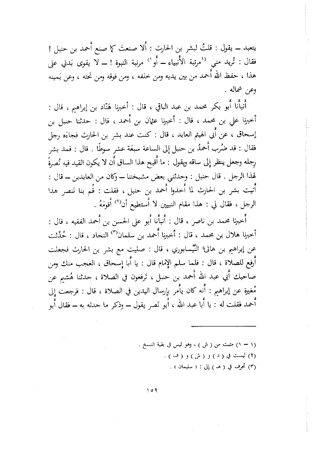 أَخبرنا محمد بن ناصر، قال: أَنبأَنا أَبو علي الحسن بن أَحمد الفقيه، قال: أخبرنا هلال بن محمد، قال: أخبرنا أَحمد بن سلمان النجاد، قال: حُدِّثت عن إبراهيم بن هانئ النَّيْسابوري، قال: صليت مع بشر بن الحارث فجعلت أَرفع للصلاة، قال: فلما سلم الإِمام قال: يا أَبا إسحاق، العجب منك ومن صاحبك أَبي عبد الله أحمد بن حنبل، تَرفعون في الصلاة، حدثنا هُشيم عن مُغيرة عن إبراهيم: أَنه كان يأمر بإِرسال اليدين في الصلاة، قال: فرجعت إِلى أَحمد فقلت له: يا أَبا عبد الله، أَبو نَصر يقول- وذكر ما حدثه به- فقال أَبو