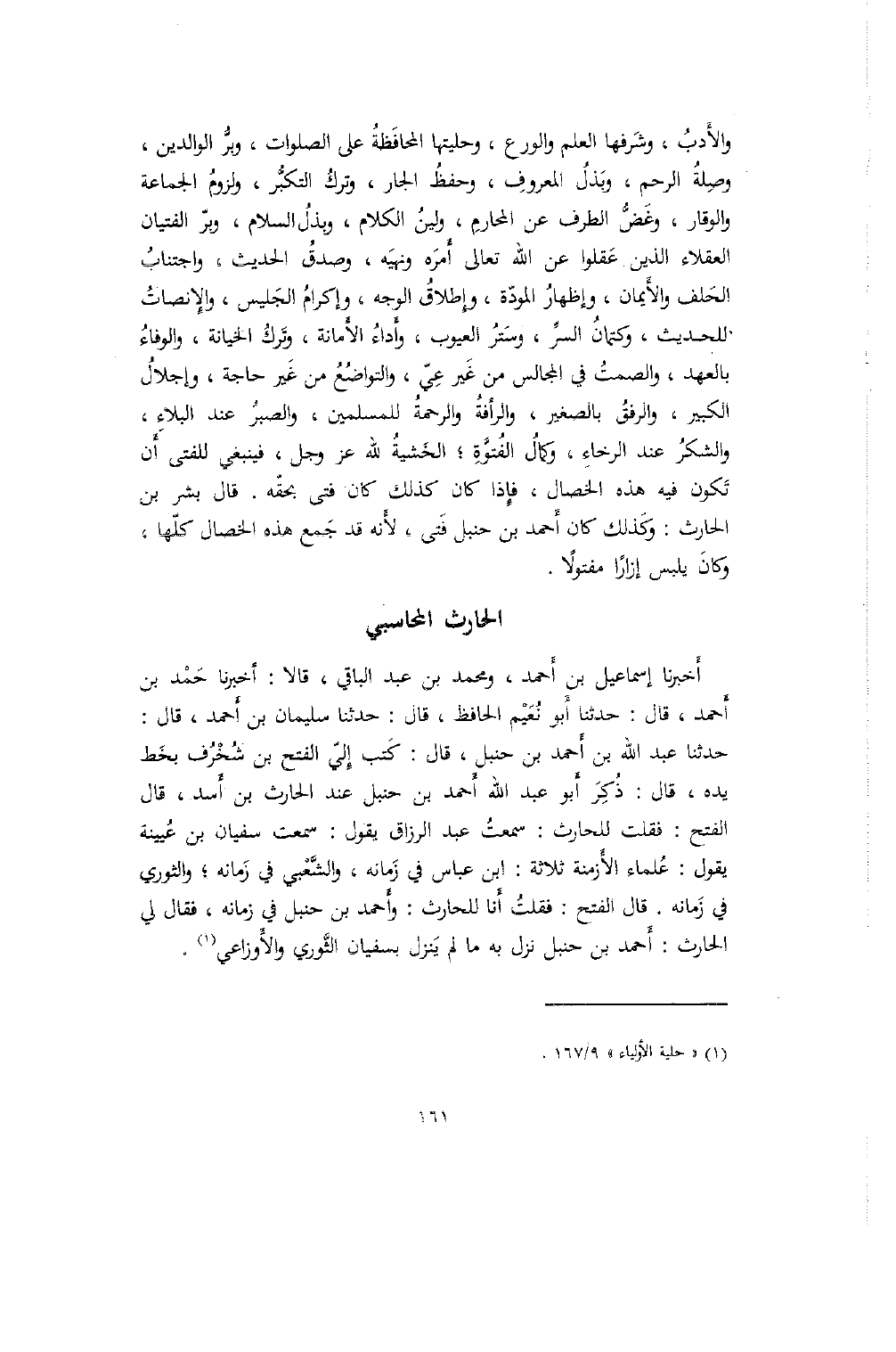 أَخبرنا إسماعيل بن أَحمد، ومحمد بن عبد الباقي، قالا: أخبرنا حَمْد بن أَحمد، قال: حدثنا أَبو نُعَيْم الحافظ، قال: حدثنا سليمان بن أَحمد، قال: حدثنا عبد الله بن أَحمد بن حنبل، قال: كَتب إِليّ الفتح بن شُخْرُف بخَط يده، قال: ذُكِرَ أَبو عبد الله أَحمد بن حنبل عند الحارث بن أَسد، قال الفتح: فقلت للحارث: سمعتُ عبد الرزاق يقول: سمعت سفيان بن عُيينة يقول: عُلماء الأَزمنة ثلاثة: ابن عباس في زَمانه، والشَّعْبي في زَمانه؛ والثوري في زَمانه. قال الفتح: فقلتُ أَنا للحارث: وأَحمد بن حنبل في زمانه، فقال لي الحارث: أَحمد بن حنبل نزل به ما لم يَنزل بسفيان الثَّوري والأَوزاعي.