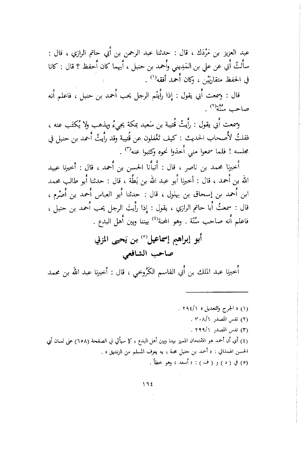 عبد العزيز بن مَرْدَك، قال: حدثنا عبد الرحمن بن أَبي حاتم الرازي، قال: سألتُ أَبي عن علي بن المَدِيني وأَحمد بن حنبل، أَيهما كان أَحفظ؟ قال: كانا في الحفظ متقاربَيْن، وكان أَحمد أفقه.