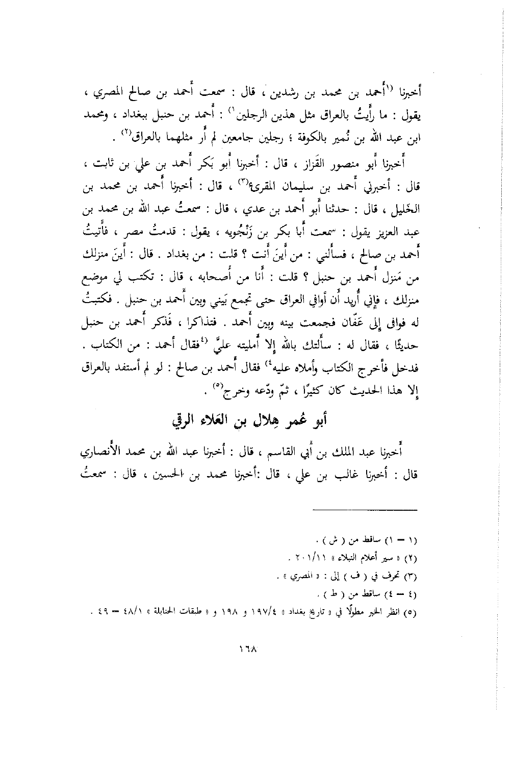 أخبرنا أَحمد بن محمد بن رشدين، قال: سمعت أَحمد بن صالح المصري، يقول: ما رأَيتُ بالعراق مثل هذين الرجلين: أَحمد بن حنبل ببغداد، ومحمد ابن عبد الله بن نُمير بالكوفة؛ رجلين جامعين لم أر مثلهما بالعراق.