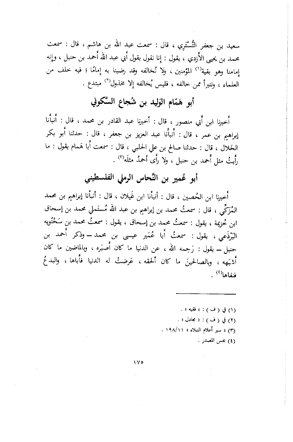 أَخبرنا ابن أَبي منصور، قال: أخبرنا عبد القادر بن محمد، قال: أَنبأَنا إبراهيم بن عمر، قال: أَنبأَنا عبد العزيز بن جعفر، قال: حدثنا أَبو بكر الخَلال، قال: حدثنا صالح بن علي الحلبي، قال: سمعت أَبا هَمام يقول: ما رأَيتُ مثل أَحمد بن حنبل، ولا رأَى أحمدُ مثلَه.