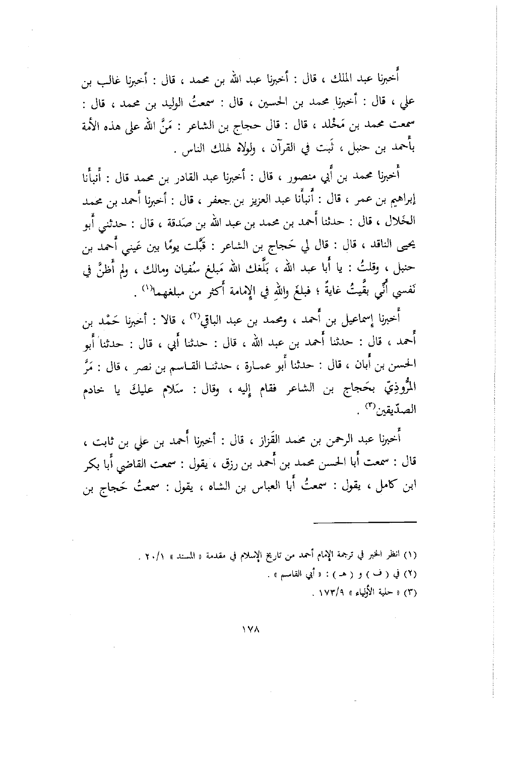 أَخبرنا محمد بن أَبي منصور، قال: أَخبرنا عبد القادر بن محمد قال: أَنبأَنا إبراهيم بن عمر، قال: أَنبأَنا عبد العزيز بن جعفر، قال: أخبرنا أَحمد بن محمد الخَلال، قال: حدثنا أَحمد بن محمد بن عبد الله بن صَدقة، قال: حدثني أَبو يحيى الناقد، قال: قال لي حَجاج بن الشاعر: قَبَّلت يوماً بين عَيني أَحمد بن حنبل، وقلتُ: يا أَبا عبد الله، بَلَّغك الله مَبلغ سُفيان ومالك، ولم أظنَّ في نَفسي أنِّي بقَّيتُ غايةً؛ فبلغَ واللهِ في الإِمامة أَكثر من مبلغهما.