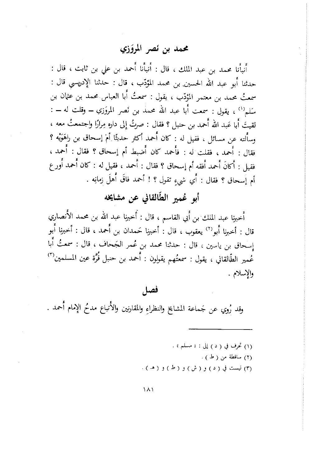 أَخبرنا عبد الملك بن أَبي القاسم، قال: أخبرنا عبد الله بن محمد الأَنصاري قال: أَخبرنا أَبو يعقوب، قال: أخبرنا حَمدان بن أَحمد، قال: أخبرنا أَبو إِسحاق بن ياسين، قال: حدثنا محمد بن عُمر الجَحاف، قال: سمعتُ أَبا عُمير الطّالقاني، يقول: سمعتُهم يقولون: أَحمد بن حنبل قُرَّة عين المسلمين والإسلام.