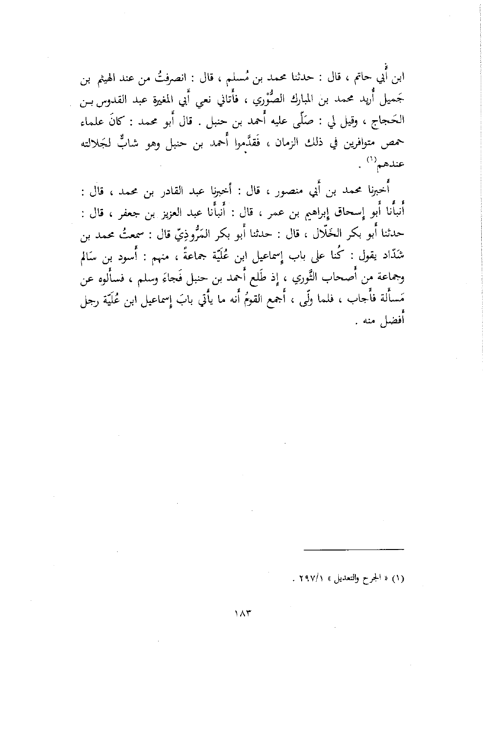 ابن أَبي حاتم، قال: حدثنا محمد بن مُسلم، قال: انصرفتُ من عند الهيثم بن جَميل أُريد محمد بن المبارك الصُّوْري، فأَتاني نعي أَبي المغيرة عبد القدوس بن الحَجاج، وقيل لي: صَلّى عليه أَحمد بن حنبل. قال أَبو محمد: كانَ علماء حمص متوافري في ذلك الزمان، فَقدَّموا أَحمد بن حنبل وهو شابٌّ لجَلالته عندهم.