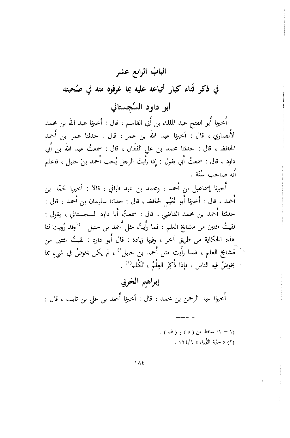 أَخبرنا إسماعيل بن أَحمد، ومحمد بن عبد الباقي، قالا: أخبرنا حَمْد بن أَحمد، قال: أخبرنا أَبو نُعَيْم الحافظ، قال: حدثنا سليمان بن أَحمد، قال: حدثنا أَحمد بن محمد القاضي، قال: سمعتُ أَبا داود السجستاني، يقول: لقيتُ مئتين من مشايخ العلم، فما رأَيتُ مثل أَحمد بن حنبل. وقد رُويت لنا هذه الحكاية من طريق آخر، وفيها زيادة: قال أَبو داود: لقيتُ مئتين من مَشايخ العلم، فما رأَيت مثل أَحمد بن حنبل، لم يكن يخوضُ في شيءٍ مما يخوضُ فيه الناس، فإِذا ذُكِرَ العِلْمُ، تكلَّم.