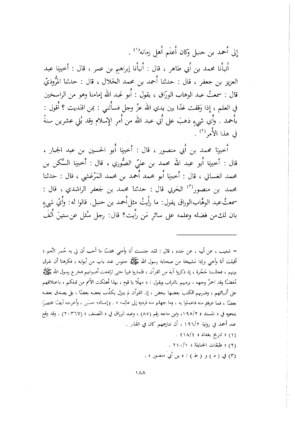 أَخبرنا محمد بن أَبي منصور، قال: أخبرنا أَبو الحسين بن عبد الجبار، قال: أخبرنا أَبو عبد الله محمد بن عليّ الصُّوري، قال: أخبرنا السَّكن بن محمد الغساني، قال: أخبرنا أَبو محمد أَحمد بن محمد المَرْعَشي، قال: حدثنا محمد بن منصور الحَربي قال: حدثنا محمد بن جَعفر الراشدي، قال: سمعتُ عبد الوهَّاب الوراق يقول: ما رأَيتُ مثل أَحمد بن حنبل. قالوا له: وأَيّ شيءٍ بان لك من فضله وعلمه على سائرِ مَن رأيت؟ قال: رجل سُئل عن ستينَ أَلفَ