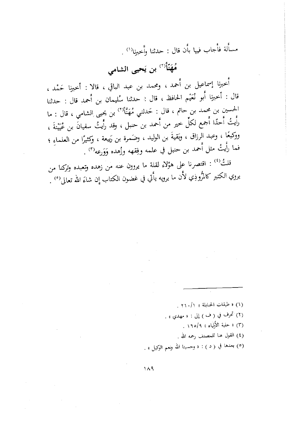 أخبرنا إسماعيل بن أَحمد، ومحمد بن عبد الباقي، قالا: أخبرنا حَمْد، قال: أخبرنا أَبو نُعَيْم الحافظ، قال: حدثنا سُليمان بن أَحمد قال: حدثنا الحسين بن محمد بن حاتم، قال: حَدثني مُهَنَّأ بن يحيى الشامي، قال: ما رأَيتُ أَحداً أَجمع لكلِّ خير من أَحمد بن حنبل، وقد رأَيتُ سفيانَ بن عُيَيْنةَ، ووكيعاً، وعبد الرزاق، وبَقيةَ بن الوليد، وضَمرة بن رَبيعة، وكثيراً من العلماءِ؛ فما رأَيتُ مثل أَحمد بن حنبل في علمه وفِقهه وزُهده وَوَرعه.