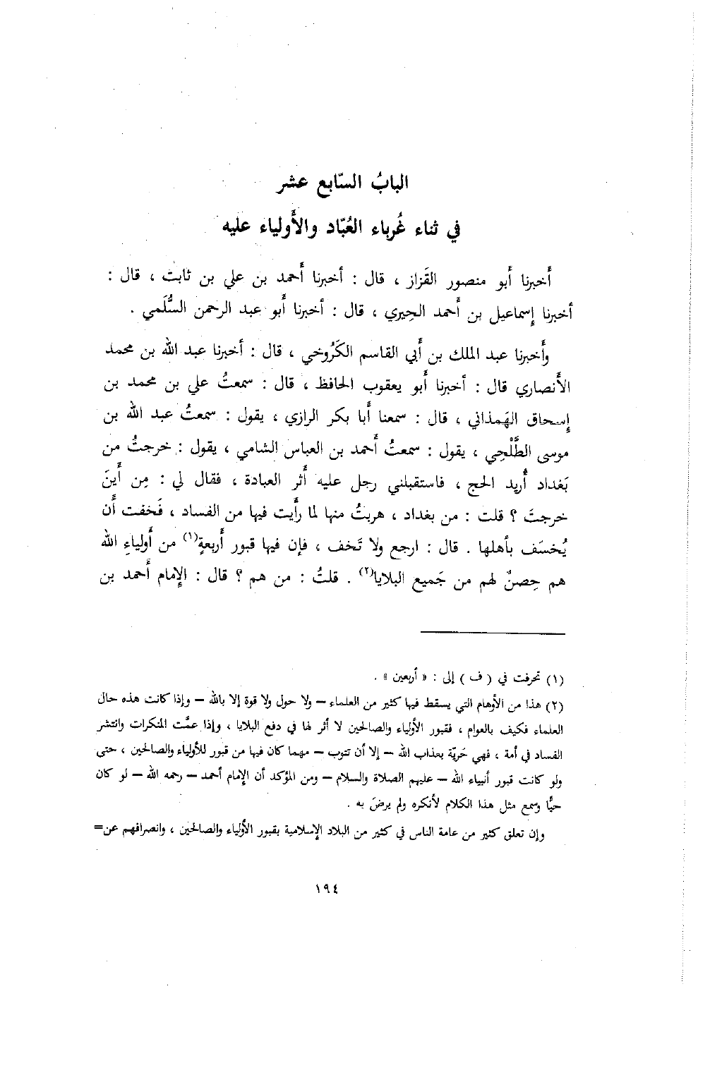 وأَخبرنا عبد الملك بن أَبي القاسم الكَرُوخي، قال: أخبرنا عبد الله بن محمد الأَنصاري قال: أخبرنا أَبو يعقوب الحافظ، قال: سمعتُ علي بن محمد بن إسحاق الهّمذاني، قال: سمعنا أَبا بكر الرازي، يقول: سمعتُ عبد الله بن موسى الطَّلْحِي، يقول: سمعتُ أَحمد بن العباس الشامي، يقول: خرجتُ من بَغداد أَريد الحج، فاستقبلني رجل عليه أَثر العبادة، فقال لي: مِن أَينَ خرجتَ؟ قلت: من بغداد، هربتُ منها لما رأَيت فيها من الفساد، فَخفت أَن يُخسَف بأهلها. قال: ارجع ولا تَخف، فإن فيها قبور أَربعةٍ من أَولياءِ الله هم حِصنٌ لهم من جَميع البلايا. قلتُ: من هم؟ قال: الإِمام أَحمد بن