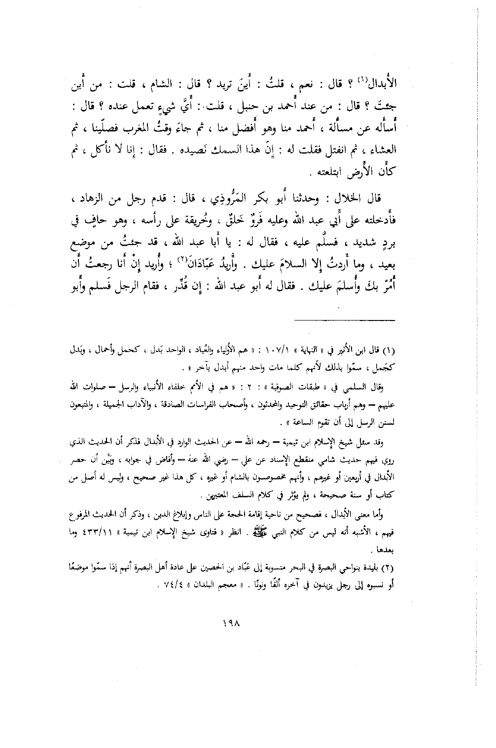 الأَبدال؟ قال: نعم، قلتُ: أَينَ تريد؟ قال: الشام، قلت: من أَين جئتَ؟ قال: من عند أَحمد بن حنبل، قلت: أَيَّ شيء تعمل عنده؟ قال: أَسأَله عن مسأَلة، أَحمد منا وهو أَفضل منا، ثم جاءَ وقتُ المغرب فصلّينا، ثم العشاء، ثم انفتل فقلت له: إِنّ هذا السمك نَصيده. فقال: إِنا لا نأكل، ثم كأَن الأَرض ابتلعته.