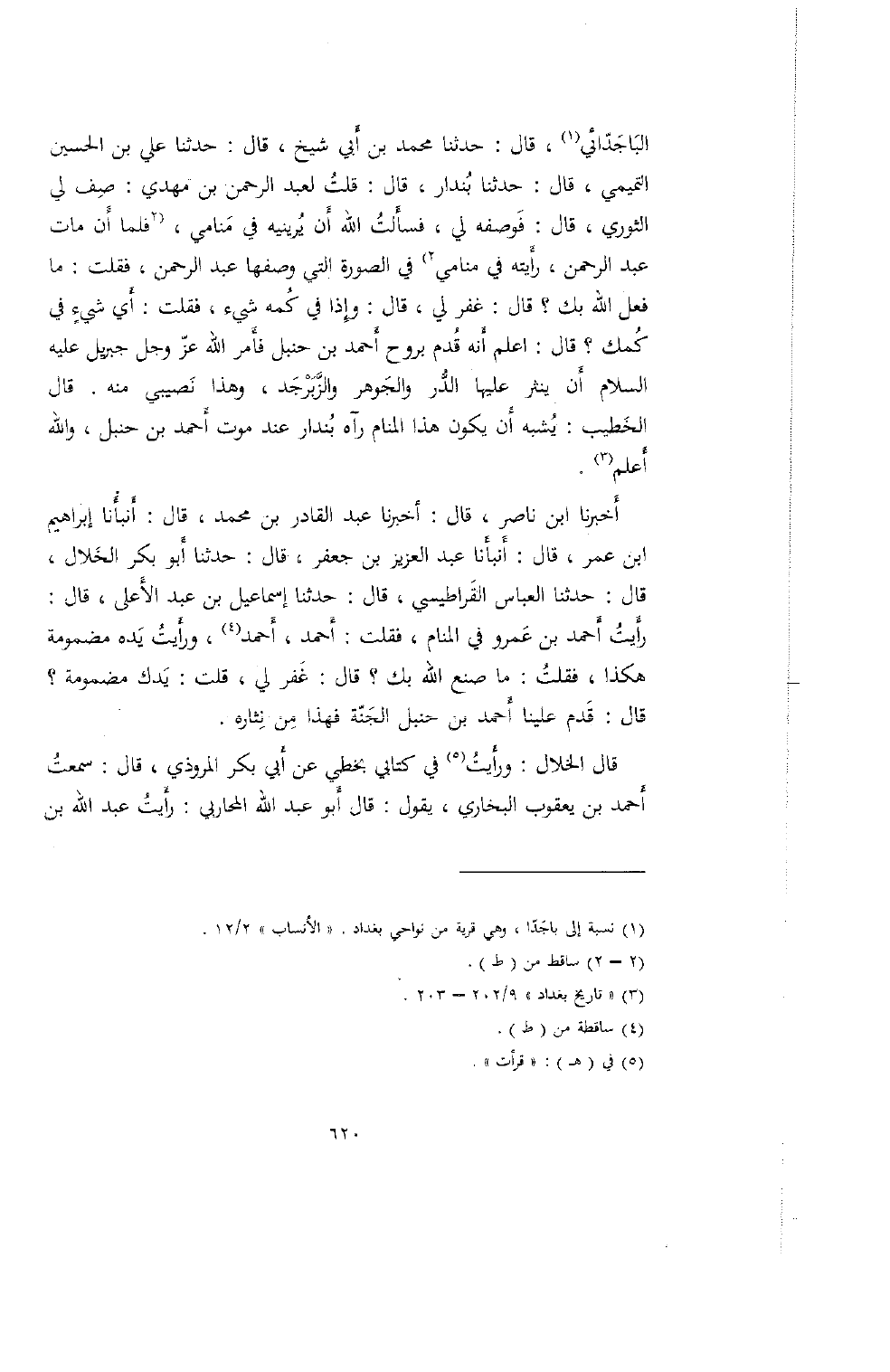الباجدائي، قال: حدثنا محمد بن أبي شيخ، قال: حدثنا علي بن الحسين التميمي، قال: حدثنا بندار، قال: قلت لعبد الرحمن بن مهدي: صف لي الثوري، قال: فوصفه لي، فسألت الله أن يرينيه في منامي، فلما أن مات عبد الرحمن، رأيته في منامي في الصورة التي وصفها عبد الرحمن، فقلت: ما فعل الله بك؟ قال: غفر لي، قال: وإذا في كمه شيء، فقلت: أي شيء في كمك؟ قال: اعلم أنه قدم بروح أحمد بن حنبل فأمر الله عز وجل جبريل عليه السلام أن ينثر عليها الدر والجوهر وازبرجد، وهذا نصيبي منه. قال الخطيب: يشبه أن يكون هذا المنام رآه بندار عند موت أحمد بن حنبل، والله أعلم.