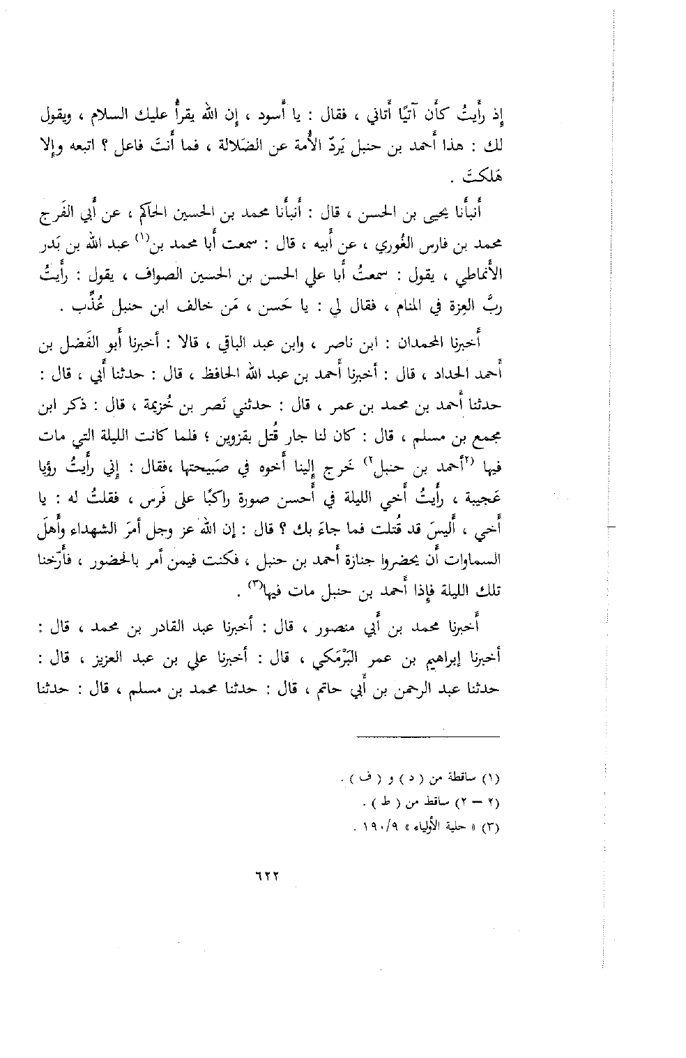 أنبأنا يحيى بن الحسن، قال: أنبأنا محمد بن الحسين الحاكم، عن أبي الفرج محمد بن فارس الغوري، عن أبيه، قال: سمعت أبا محمد بن عبد الله بن بدر الأنماطي، يقول: سمعت أبا علي الحسن بن الحسين الصواف، يقول: رأيت رب العزة في المنام، فقال لي: يا حسن، من خالف ابن حنبل عذب.