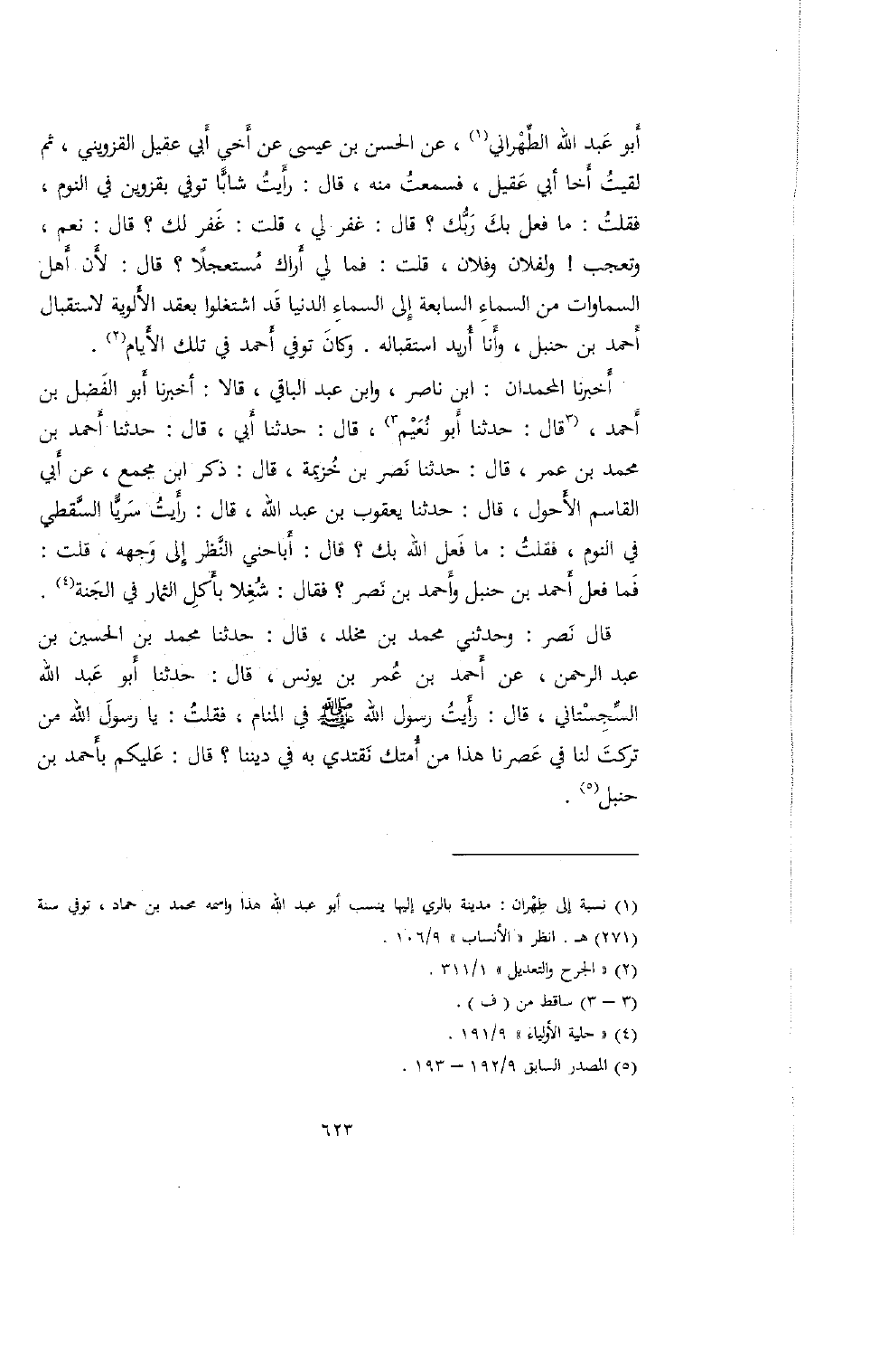 قال نصر: وحدثني محمد بن مخلد، قال: حدثنا محمد بن الحسين بن عبد الرحمن، عن أحمد بن عمر بن يونس، قال: حدثنا أبو عبد الله السجستاني، قال: رأيت رسول الله صلى الله عليه وسلم في المنام، فقلت: يا رسول الله من تركت لنا في عصرنا هذا من أمتك نقتدي به في ديننا؟ قال: عليكم بأحمد بن حنبل.