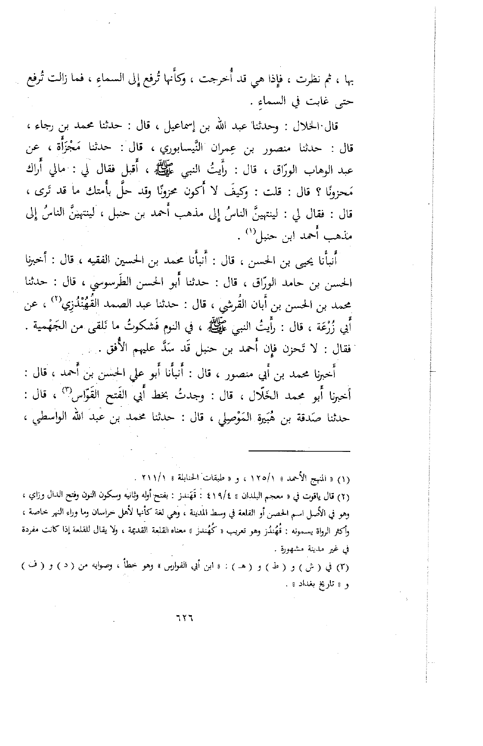 قال الخلال: وحدثنا عبد الله بن إسماعيل، قال: حدثنا محمد بن رجاء، قال: حدثنا منصور بن عمران النيسابوري، قال: حدثنا مجزأة، عن عبد الوهاب الوراق، قال: رأيت النبي صلى الله عليه وسلم، أقبل فقال لي: مالي أراك محزوناً؟ قال: قلت: وكيف لا أكون محزوناً وقد حل بأمتك ما قد ترى، قال: فقال لي: لينتهين الناس إلى مذهب أحمد بن حنبل، لينتهين الناس إلى مذهب أحمد بن حنبل.