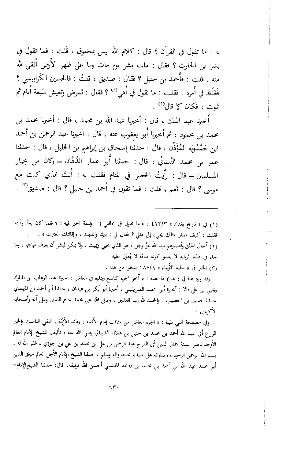 أخبرنا عبد الملك، قال: أخبرنا عبد الله بن محمد، قال: أخبرنا محمد بن محمد بن محمود، ثم أخبرنا أبو يعقوب عنه، قال: أخبرنا عبد الرحمن بن أحمد بن حمدويه المؤذن، قال: حدثنا إسحاق بن إبراهيم بن الخليل، قال: حدثنا عمر بن محمد النسائي، قال: حدثنا أبو عمار الدهان- وكان من خيار المسلمين- قال: رأيت الخضر في المنام فقلت له: أنت الذي كنت مع موسى؟ قال: نعم، قلت: فما تقول في أحمد بن حنبل؟ قال: صديق.