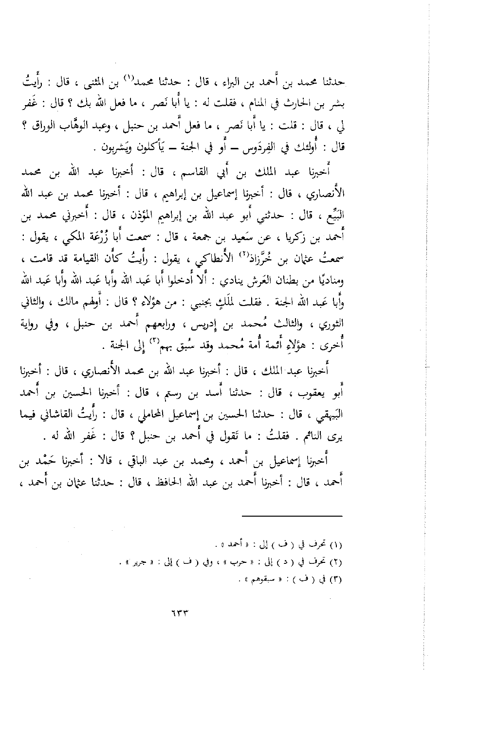 حدثنا محمد بن أحمد بن البراء، قال: حدثنا محمد بن المثنى، قال: رأيت بشر بن الحارث في المنام، فقلت له: يا أبا نصر، ما فعل الله بك؟ قال: غفر لي، قال: قلت: يا أبا نصر، ما فعل أحمد بن حنبل، وعبد الوهاب الوراق؟ قال: أولئك في الفردوس- أو في الجنة- يأكلون ويشربون.