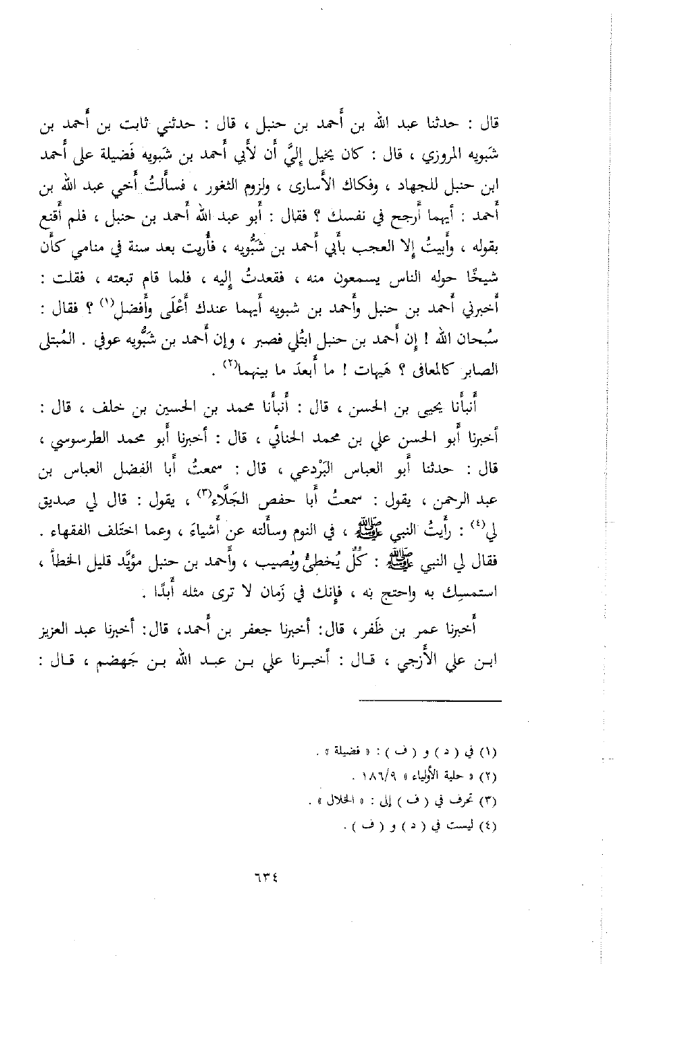 أنبأنا يحيى بن الحسن، قال: أنبأنا محمد بن الحسين بن خلف، قال: أخبرنا أبو الحسن علي بن محمد الحنائي، قال: أخبرنا أبو محمد الطرسوسي، قال: حدثنا أبو العباس البردعي، قال: سمعت أبا الفضل العباس بن عبد الرحمن، يقول: سمعت أبا حفص الجلاء، يقول: قال لي صديق لي: رأيت النبي صلى الله عليه وسلم، في النوم وسألته عن أشياء، وعما اختلف الفقهاء. فقال لي النبي صلى الله عليه وسلم: كل يخطئ ويصيب، وأحمد بن حنبل مؤيد قليل الخطأ، استمسك به واحتج به، فإنك في زمان لا ترى مثله أبداً.