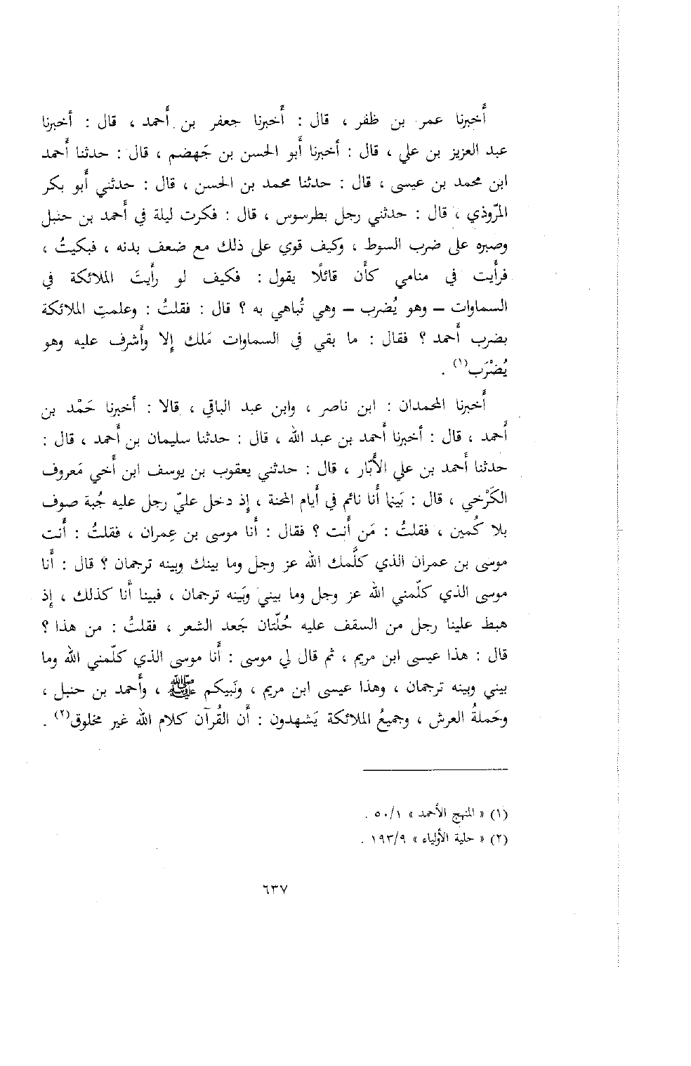 أخبرنا عمر بن ظفر، قال: أخبرنا جعفر بن أحمد، قال: أخبرنا عبد العزيز بن علي، قال: أخبرنا أبو الحسن بن جهضم، قال: حدثنا أحمد ابن محمد بن عيسى، قال: حدثنا محمد بن الحسن، قال: حدثني أبو بكر المروذي، قال: حدثني رجل بطرسوس، قال: فكرت ليلة في أحمد بن حنبل وصبره على ضرب السوط، وكيف قوي على ذلك مع ضعف بدنه، فبكيت، فرأيت في منامي كأن قائلاً يقول: فكيف لو رأيت الملائكة في السماوات- وهو يضرب- وهي تباهي به؟ قال: فقلت: وعلمت الملائكة بضرب أحمد؟ فقال: ما بقي في السماوات ملك لا وأشرف عليه وهو يضرب.